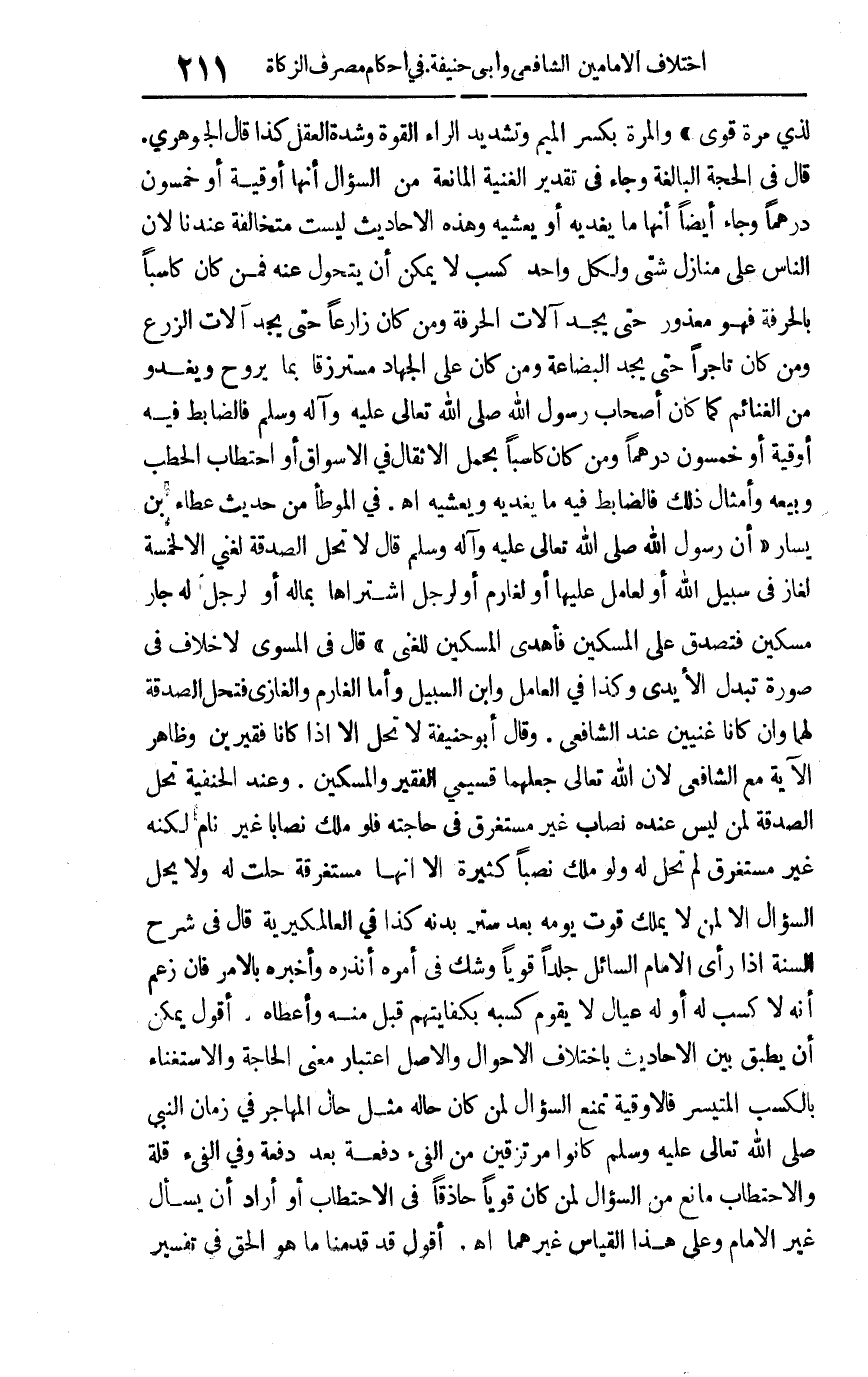 لذي مرة قوي". والمرة بكسر الميم وتشديد الراء القوة وشدة العقل. كذا قال الجوهري قال في الحجة البالغة: وجاء في تقدير الغنية المانعة من السؤال أنها أوقية أو خمسون درهما, وجاء أيضا أنها ما يغديه أو يعشيه وهذه الأحاديث ليست متخالفة عندنا لأن الناس على منازل شتى ولكل واحد كسب لا يمكن أن يتحول عنه فمن كان كاسبا بالحرفة فهو معذور حتى يجد آلات الحرفة ومن كان زارعا حتى يجد آلات الزرع ومن كان تاجرا حتى يجد البضاعة ومن كان على الجهاد مسترزقا بما يروح ويغدو من الغنائم كما كان أصحاب رسول الله صلى الله تعالى عليه وآله وسلم فالضابط فيه أوقية أو خمسون درهما ومن كان كاسبا بحمل الأثقال في الأسواق أو احتطاب الحطب وبيعه وأمثال ذلك فالضابط فيه ما يغديه ويعشيه أهـ. في الموطأ من حديث عطاء بن يسار أن رسول الله صلى الله تعالى عليه وآله وسلم قال: "لا تحل الصدقة لغني إلا لخمسة: لغاز في سبيل الله أو لعامل عليها أو لغارم أو لرجل اشتراها بماله أو لرجل له جار مسكين فتصدق على المسكين فأهدى المسكين للغني". قال في المسوى: لا خلاف في صورة تبدل الأيدي وكذا في العامل وابن السبيل, وأما الغارم والغازي فتحل الصدقة لهما وإن كانا غنيين عند الشافعي. وقال أبو حنيفة: لا تحل إلا إذا كانا فقيرين وظاهر الآية مع الشافعي لأن الله تعالى جعلهما قسيمي الفقير والمسكين وعند الحنفية تحل الصدقة لمن ليس عنده نصاب غير مستغرق في حاجته فلو ملك نصابا غير نام لكنه غير مستغرق لم تحل له ولو ملك نصبا كثيرة إلا أنها مستغرقة حلت له, ولا يحل السؤال إلا لمن يملك قوت يومه بعد ستر بدنه كذا في العالمكيرية. قال في شرح السنة: إذا رأى الإمام السائل جلدا قويا وشك في أمره أنذره وأخبره بالأمر فإن زعم أنه لا كسب له أو له عيال لا يقوم كسبه بكفايتهم قبل منه وأعطاه. أقول: يمكن أن يطبق بين الأحاديث باختلاف الأحوال والأصل اعتبار معنى الحاجة والاستغناء بالكسب المتيسر فالأوقية تمنع السؤال لمن كان حاله مثل حال المهاجر في زمان النبي صلى الله تعالى عليه وسلم كانوا مرتزقين من الفيء دفعة بعد دفعة وفي الفيء قلة والاحتطاب مانع من السؤال لمن كان قويا حاذقا في الاحتطاب أو أراد أن يسأل غير الإمام وعلى هذا القياس غيرهما اهـ. أقول: قد قدمنا ما هو الحق في تفسير