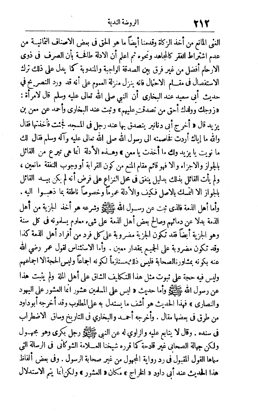 الغنى المانع من أخذ الزكاة وقدمنا أيضا ما هو الحق في بعض الأصناف الثمانية من عدم اشتراط الفقر كالمجاهد ونحوه, ثم اعلم أن الأدلة طافحة بأن الصرف في ذوي الأرحام أفضل من غير فرق بين الصدقة الواجبة والمندوبة كما يدل على ذلك ترك الاستفصال في مقام الاحتمال فإنه ينزل منزلة العموم على أنه قد ورد التصريح في حديث أبي سعيد عند البخاري أن النبي صلى الله تعالى عليه وسلم قال لامرأة: "زوجك وولدك أحق من تصدقت عليهم" وثبت عند البخاري وأحمد عن معن بن يزيد قال: أخرج أبي دنانير يتصدق بها عند رجل في المسجد فجئت فأخذتها فقال: والله ما إياك أردت فخاصمته إلى رسول الله صلى الله تعالى عليه وآله وسلم فقال: "لك ما نويت يا يزيد ولك ما أخذت ما معن" وهذه الأدلة إنما هي تبرع من القائل بالجواز والإجزاء وإلا فهو قائم مقام المنع من كون القرابة أو وجوب النفقة مانعين ولم يأت القائل بذلك بدليل ينفق في محل النزاع على فرض أنه لم يكن بيد القائل بالجواز إلا التمسك بالأصل فكيف والأدلة عموما وخصوصا ناطقة بما ذهبوا إليه, وأما أهل الذمة فالذي ثبت عن رسول الله صلى الله عليه وسلم وشرعه هو أخذ الجزية من أهل الذمة بدلا عن دمائهم وصالح بعض أهل الذمة على شيء معلوم يسلمونه في كل سنة وهو الجزية أيضا فقد تكون الجزية مضروبة على كل فرد من أفراد أهل الذمة كذا وقد تكون مضروبة على الجميع بمقدار معين, وأما الاستئناس لقول عمر رضي الله عنه بكونه بمشاورة الصحابة فليس ذلك مستلزما لكونه إجماعا وليس الحجة إلا إجماعهم وليس فيه حجة على ثبوت مثل هذا التكليف الشاق على أهل الملة, ولم يثبت هذا عن رسول الله صلى الله عليه وسلم. وأما حديث: "ليس على المسلمين عشور إنما العشور على اليهود والنصارى" فهذا الحديث هو أشف ما يستدل به على المطلوب وقد أخرجه أبو داود من طرق في بعضها مقال وأخرجه أحمد والبخاري في التاريخ وساق الاضطراب في سنده وقال: لا يتابع عليه والراوي له عن النبي صلى الله عليه وسلم رجل بكري وهو مجهول ولكن جهالة الصحابي غير قادحة كما قرره شيخنا العلامة الشوكاني في الرسالة التي سماها القول المقبول في رد رواية المجهول من غير صحابة الرسول, وفي بعض ألفاظ هذا الحديث عند أبي داود: "الخراج" مكان: "العشور" ولكن إنما يتم الاستدلال
