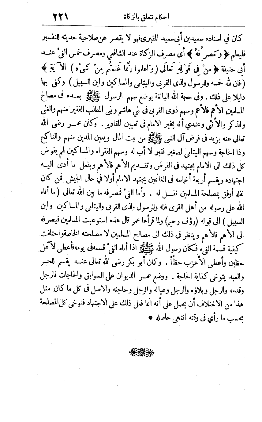 كان في إسناده سعيد بن أبي سعيد المقبري فهو لا يقصر عن صلاحية حديثه للتفسير فليعلم, ومصرفه أي مصرف الزكاة عند الشافعي ومصرف خمس الفيء عند أبي حنيفة. من في قوله تعالى: {وَاعْلَمُوا أَنَّمَا غَنِمْتُمْ مِنْ شَيْءٍ فَأَنَّ لِلَّهِ خُمُسَهُ وَلِلرَّسُولِ وَلِذِي الْقُرْبَى وَالْيَتَامَى وَالْمَسَاكِينِ وَابْنِ السَّبِيلِ} وكفى بها دليلا على ذلك, وفي حجة الله البالغة يوضع سهم الرسول صلى الله عليه وسلم بعده في مصالح المسلمين الأهم فالأهم وسهم ذوي القربى في بني هاشم وبني المطلب الفقير منهم والغني والذكر والأنثى وعندي أنه يخير الإمام في تعيين المقادير وكان عمر رضي الله تعالى عنه يزيد في فرض آل النبي صلى الله عليه وسلم من بيت المال ويعين المدين منهم والناكح وذا الحاجة, وسهم اليتامى لصغير فقير لا أب له وسهم الفقراء والمساكين لهم يفوض كل ذلك إلى الإمام يجتهد في الفرض وتقديم الأهم فالأهم ويفعل ما أدى إليه اجتهاده ويقسم أربعة أخماسه في الغانمين يجتهد الإمام أولا في حال الجيش فمن كان نفله أوفق بمصلحة المسلمين نفل له وأما الفيء فمصرفه ما بين الله تعالى: {مَا أَفَاءَ اللَّهُ عَلَى رَسُولِهِ مِنْ أَهْلِ الْقُرَى فَلِلَّهِ وَلِلرَّسُولِ وَلِذِي الْقُرْبَى وَالْيَتَامَى وَالْمَسَاكِينِ وَابْنِ السَّبِيلِ} إلى قوله: {رَؤُوفٌ رَحِيمٌ} ولما قرأها عمر قال: هذه استوعبت المسلمين فيصرفه إلى الأهم فالأهم, ويُنظر في ذلك إلى مصالح المسلمين لا مصلحته الخاصة واختلفت كيفية قسمة الفيء فكان رسول الله صلى الله عليه وسلم إذا أتاه الفيء قسمه في يوم فأعطى الآهل حظين وأعطى الأعزب حظا, وكان أبو بكر رضي الله تعالى عنه يقسم للحر والعبد يتوخى كفاية الحاجة ووضع عمر الديوان على السوابق والحاجات فالرجل وقِدمه والرجل وبلاؤه والرجل وعياله والرجل وحاجته والأصل في كل ما كان مثل هذا من الاختلاف أن يُحمل على أنه إنما فعل ذلك على الاجتهاد فتوخى كل المصلحة بحسب ما رأى في وقته انتهى حاصله.