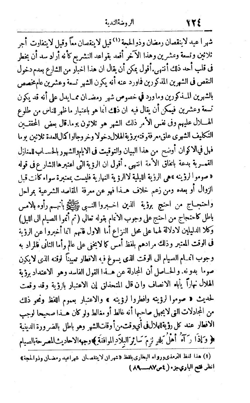 شهرا عيد لا ينقصان رمضان وذو الحجة1, قيل لا ينقصان معا وقيل لا يتفاوت أجر ثلاثين وتسعة وعشرين وهذا الآخر أقعد بقواعد التشريع كأنه أراد سد أن يخطر في قلب أحد ذلك انتهى. أقول: يمكن أن يقال: إن هذا إخبار من الشارع بعدم دخول النقص في الشهرين المذكورين فما ورد عنه أنه يكون الشهر تسعة وعشرين عام مخصص بالشهرين المذكورين وما ورد في خصوص شهر رمضان مما يدل على أنه قد يكون تسعة وعشرين فيمكن أن يقال فيه إن ذلك إنما هو باعتبار ما ظهر للناس من طلوع الهلال عليهم وفي نفس الأمر ذلك الشهر هو ثلاثون يوما. قال بعض المحققين: التكليف الشهري علق معرفة وقته برؤية الهلال دخولا وخروجا أو إكمال العدة ثلاثين يوما فهل في الأكوان أوضح من هذا البيان والتوقيت في الأيام والشهور بالحساب للمنازل القمرية بدعة باتفاق الأمة انتهى. أقول: إن الرؤية التي اعتبرها الشارع في قوله: "صوموا لرؤيته" هي الرؤية الليلية لا الرؤية النهاية فليست بمعتبرة سواء كانت قبل الزوال أو بعده ومن زعم خلاف هذا فهو عن معرفة المقاصد الشرعية بمراحل واحتجاج من احتج برؤية الذين أخبروا النبي صلى الله عليه وسلم بأنهم رأوه بالأمس باطل كاحتجاج من احتج على وجوب الإتمام بقول تعالى: {ثُمَّ أَتِمُّوا الصِّيَامَ إِلَى اللَّيْلِ} وكلا الدليلين لا دلالة لهما على محل النزاع, وأما الأول فإنهم إنما أخبروا عن الرؤية في الوقت المعتبر وذلك مرادهم بلفظ أمس كما لا يخفى على عالم, وأما الثاني فالمراد به وجوب إتمام الصيام إلى الوقت الذي يسوغ فيه الإفطار تعيينا لوقته الذي لا يكون صوما بدونه. والحاصل: أن المجادلة عن هذا القول الفاسد وهو الاعتداد برؤية الهلال نهارا يأباه الإنصاف وإن قال المتخذلق إن الاعتبار بالرؤية وقد وقعت لحديث: "صوموا لرؤيته وأفطروا لرؤيته" والاعتبار بعموم اللفظ ونحو ذلك من المجادلات التي لا يجهل صاحبها أنه غالط أو مغالط ولو كان هذا صحيحا لوجب الإفطار عند كل رؤية للهلال في أي وقت من أوقات الشهر وهو باطل بالضرورة الدينية. "وإذا رآه أهل بلد لزم سائر البلاد الموافقة" وجهه الأحاديث المصرحة بالصيام