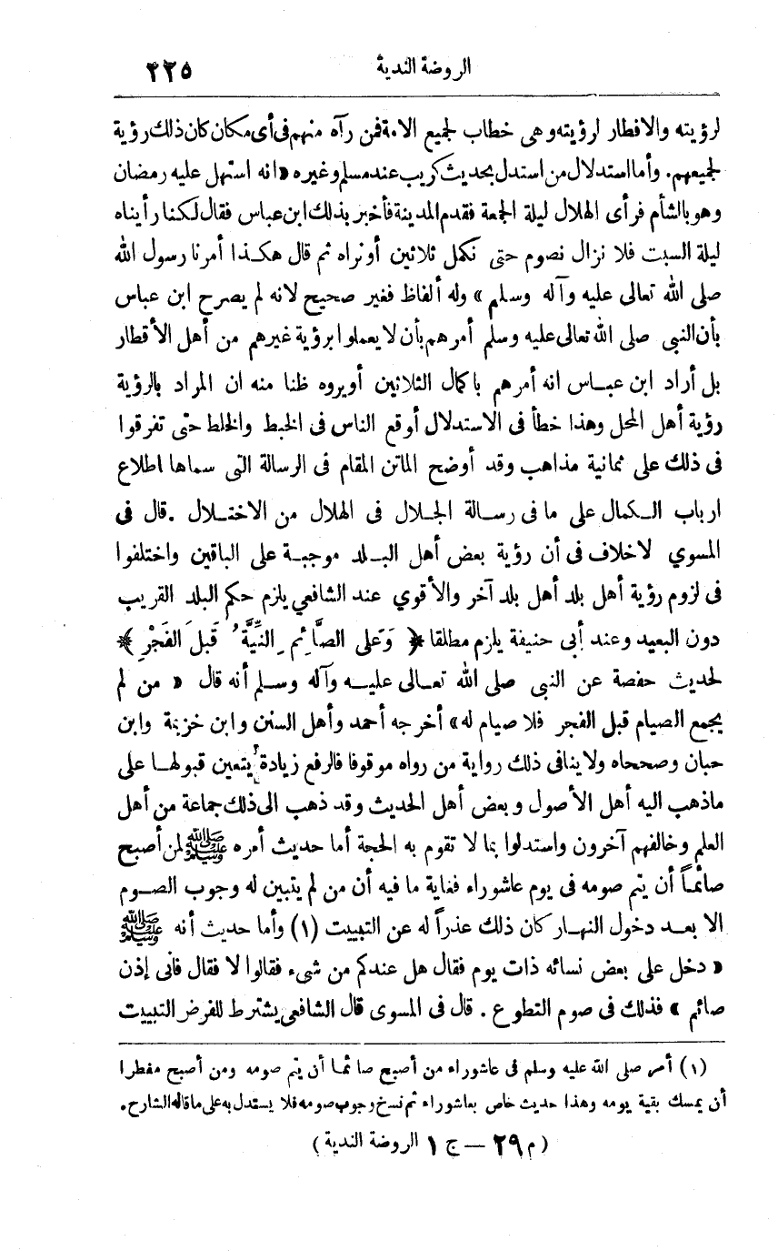 لرؤيته والإفطار لرؤيته وهي خطاب لجميع الأمة فمن رآه منهم في أي مكان كان ذلك رؤية لجميعهم, وأما استدلال من استدل بحديث كريب عند مسلم وغيره: أنه استهل عليه رمضان وهو بالشام فرأى الهلال ليلة الجمعة فقدم المدينة فأخبر بذلك ابن عباس فقال: لكنا رأيناه ليلة السبت فلا نزال نصوم حتى نكمل ثلاثين أو نراه, ثم قال: هكذا أمرنا رسول الله صلى الله تعالى عليه وآله وسلم وله ألفاظ فغير صحيح لأنه لم يصرح ابن عباس بأن النبي صلى الله تعالى عليه وسلم أمرهم بأن لا يعملوا برؤية غيرهم من أهل الأقطار بل أراد ابن عباس أنه أمرهم بإكمال الثلاثين أو يروه ظنا منه أن المراد بالرؤية رؤية أهل المحل وهذا خطأ في الاستدلال أوقع الناس في الخبط والخلط حتى تفرقوا في ذلك على ثمانية مذاهب, وقد أوضح الماتن المقام في الرسالة التي سماها إطلاع أرباب الكمال على ما في رسالة الجلال في الهلال من الاختلال. قال في المسوى: لا خلاف في أن رؤية بعض أهل البلد موجبة على الباقين واختلفوا في لزوم رؤية أهل بلد أهل بلد آخر والأقوى عند الشافعي يلزم حكم البلد القريب دون البعيد وعند أبي حنيفة يلزم مطلقا "وعلى الصائم النية قبل الفجر" لحديث حفصة عن النبي صلى الله تعالى عليه وآله وسلم أنه قال: "من لم يجمع الصيام قبل الفجر فلا صيام له" أخرجه أحمد وأهل السنن وابن خزيمة وابن حبان وصححاه, ولا ينافي ذلك رواية من رواه موقوفا فالرفع زيادة يتعين قبولها على ما ذهب إليه أهل الأصول وبعض أهل الحديث, وقد ذهب إلى ذلك جماعة من أهل العلم وخالفهم آخرون واستدلوا بما لا تقوم به الحجة. أما حديث أمره صلى الله عليه وسلم لمن أصبح صائما أن يتم صومه في يوم عاشوراء فغاية ما فيه أن من لم يتبين له وجوب الصوم إلا بعد دخول النهار كان ذلك عذرا له عن التبييت1, وأما حديث أنه صلى الله عليه وسلم: دخل على بعض نسائه ذات يوم فقال: هل عندكم من شيء؟ فقالوا: لا, فقال: "فإني إذن صائم" فذلك في صوم التطوع. قال في المسوى: قال الشافعي: يشترط للفرض التبييت