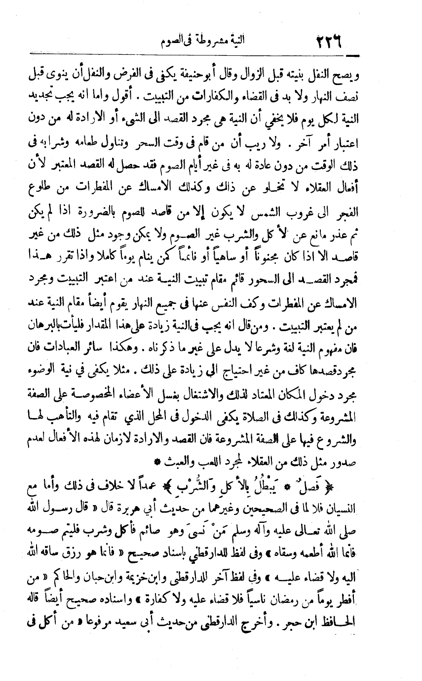 ويصح النفل بنيته قبل الزوال وقال أبو حنيفة: يكفي في الفرض والنفل وأن ينوي قبل نصف النهار ولا بد في القضاء والكفارات من التبييت. أقول: وأما أنه يجب تجديد النية لكل يوم فلا يخفى أن النية هي مجرد القصد إلى الشيء أو الإرادة له من دون اعتبار أمر آخر ولا ريب أن من قام في وقت السحر وتناول طعامه وشرابه في ذلك الوقت من دون عادة له به في غير أيام الصوم فقد حصل له القصد المعتبر لأن أفعال العقلاء لا تخلو عن ذلك وكذلك الإمساك عن المفطرات من طلوع الفجر إلى غروب الشمس لا يكون إلا من قاصد للصوم بالضرورة إذا لم يكن ثم عذر مانع عن الأكل والشرب غير الصوم, ولا يمكن وجود مثل ذلك من غير قاصد إلا إذا كان مجنونا أو ساهيا أو نائما كمن ينام يوما كاملا, وإذا تقرر هذا فمجرد القصد إلى السحور قائم مقام تبييت النية عند من اعتبر التبييت ومجرد الإمساك عن المفطرات وكف النفس عنها في جميع النهار يقوم أيضا مقام النية عند من لم يعتبر التبييت, ومن قال إنه يجب في النية زيادة على هذا المقدار فليأت بالبرهان فإن مفهوم النية لغة وشرعا لا يدل على غير ما ذكرناه وهكذا سائر العبادات فإن مجرد قصدها كاف من غير احتياج إلى زيادة على ذلك, مثلا يكفي في نية الوضوء مجرد دخول المكان المعتاد لذلك والاشتغال بغسل الأعضاء المخصوصة على الصفة المشروعة, وكذلك في الصلاة يكفي الدخول في المحل الذي تقام فيه والتأهب لها والشروع فيها على الصفة المشروعة فإن القصد والإرادة لا زمان لهذه الأفعال لعدم صدور مثل ذلك من العقلاء لمجرد اللعب والعبث.