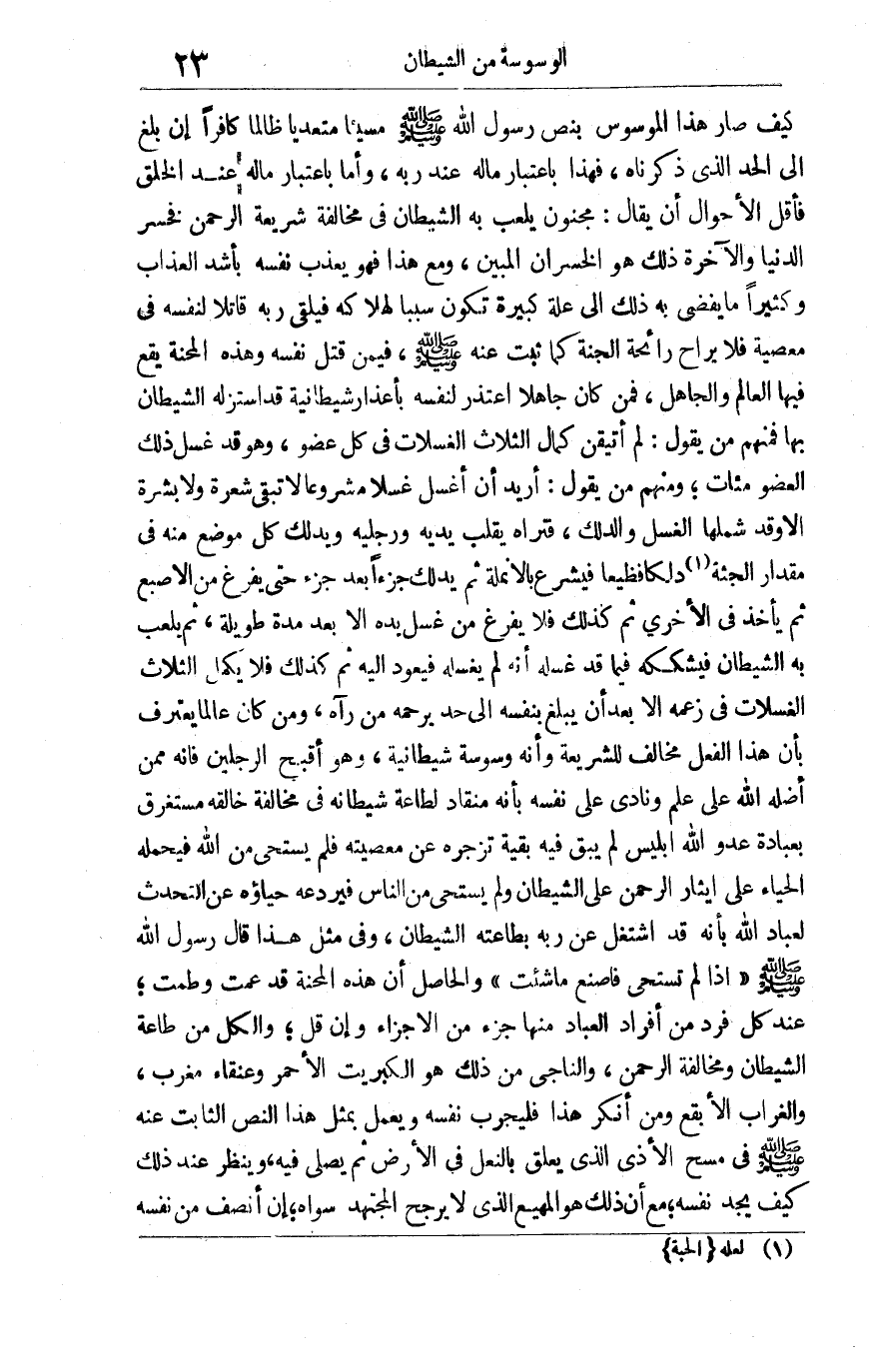 كيف صار هذا الموسوس بنص رسول الله صلى الله عليه وسلم مسيئا متعديا ظالما كافرا إن بلغ إلى الحد الذي ذكرناه, فهذا باعتبار ما له عند ربه وأما باعتبار ما له عند الخلق فأقل الأحوال أن يقال: مجنون يلعب به الشيطان في مخالفة شريعة الرحمن فخسر الدنيا والآخرة ذلك هو الخسران المبين, ومع هذا فهو يعذب نفسه بأشد العذاب وكثيرا ما يفضي به ذلك إلى علة كبيرة تكون سببا لهلاكه فيلقى ربه قاتلا لنفسه في معصية فلا يراح رائحة الجنة كما ثبت عنه صلى الله عليه وسلم فيمن قبل نفسه وهذه المحنة يقع فيها العالم والجاهل فمن كان جاهلا اعتذر لنفسه بأعذار شيطانية قد استزله الشيطان بها فمنهم من يقول: لم أتيقن كمال الثلاث الغسلات في كل عضو وهو قد غسل ذلك العضو مئات ومنهم من يقول: أريد أن أغسل غسلا مشروعا لا تبقى شعرة ولا بشرة إلا وقد شملها الغسل والدلك فتراه يقلب يديه ورجليه ويدلك كل موضع منه في مقدار الجثة1 دلكا فظيعا فيشرع بالأنملة ثم يدلك جزءا بعد جزء حتى يفرغ من الأصبع ثم يأخذ في الأخرى ثم كذلك فلا يفرغ من غسل يده إلا بعد مدة طويلة ثم يلعب به الشيطان فيشككه فيما قد غسله أنه لم يغسله فيعود إليه ثم كذلك فلا يكمل الثلاث الغسلات في زعمه إلا بعد أن يبلغ بنفسه إلى حد يرحمه من رآه ومن كان عالما يعترف بأن هذا الفعل مخالف للشريعة وأنه وسوسة شيطانية وهو أقبح الرجلين فإنه ممن أضله الله على علم ونادى على نفسه بأنه منقاد لطاعة شيطانه في مخالفة خالقه مستغرق بعبادة عدو الله إبليس لم يبق فيه بقية تزجره عن معصيته فلم يستحي من الله فيحمله الحياء على إيثار الرحمن على الشيطان ولم يستحي من الناس فيردعه حياؤه عن التحدث لعباد الله بأنه قد اشتغل عن ربه بطاعته الشيطان, وفي مثل هذا قال رسول الله صلى الله عليه وسلم: "إذا لم تستح فاصنع ما شئت". والحاصل: أن هذه المحنة قد عمت وطمت عند كل فرد من أفراد العباد منها جزء من الأجزاء وإن قل والكل من طاعة الشيطان ومخالفة الرحمن والناجي من ذلك هو الكبريت الأحمر وعنقاء مغرب والغراب الأبقع ومن أنكر هذا فليجرب نفسه ويعمل بمثل هذا النص الثابت عنه صلى الله عليه وسلم في مسح الأذى الذي يعلق بالنعل في الأرض ثم يصلي فيه وينظر عند ذلك كيف يجد نفسه مع أن ذلك هو المهيع الذي لا يرجح المجتهد سواه إن أنصف من نفسه