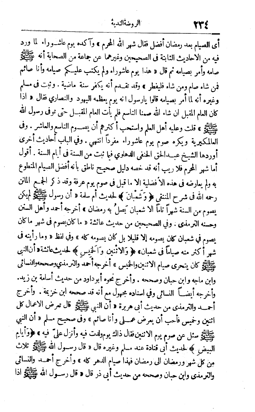 أي الصيام بعد رمضان أفضل؟ فقال: "شهر الله المحرم" وآكده يوم عاشوراء لما ورد فيه من الأحاديث الثابتة في الصحيحين وغيرهما عن جماعة من الصحابة أنه صلى الله عليه وسلم صامه وأمر بصيامه ثم قال: "هذا يوم عاشوراء ولم يكتب عليكم صيامه وأنا صائم فمن شاء صام ومن شاء فليفطر", وقد تقدم أنه يكفر سنة ماضية, وثبت في مسلم وغيره أنه لما أمر بصيامه قالوا يا رسول الله: إنه يوم يعظمه اليهود والنصارى فقال: "إذا كان العام المقبل إن شاء الله صمنا التاسع" فلم يأت العام المقبل حتى توفي رسول الله صلى الله عليه وسلم. قلت: وعليه أهل العلم, واستحب أكثرهم أن يصوم التاسع والعاشر, وفي العالمكيرية: ويكره صوم يوم عاشوراء مفردا انتهى. وفي الباب أحاديث أخرى أوردها الشيخ عبد الحق الحنفي الدهلوي فيما ثبت من السنة في أيام السنة. أقول: أما شهر المحرم فلا ريب أنه قد خصه دليل صحيح ناطق بأنه أفضل الصيام المتطوع به ولم يعارضه في هذه الأفضلية إلا ما قيل في صوم يوم عرفة وقد ذكر الجمع الماتن رح في شرح المنتقى. وشعبان لحديث أم سلمة أن رسول الله صلى الله عليه وسلم لم يكن يصوم من السنة شهرا تاما إلى شعبان يصل به رمضان أخرجه أحمد وأهل السنن وحسنه الترمذي وفي الصحيحين من حديث عائشة ما كان يصوم في شهر ما كان يصوم في شعبان كان يصومه إلا قليلا بل كان يصومه كله. وفي لفظ: وما رأيته في شهر أكثر منه صياما في شعبان. "والاثنين والخميس" لحديث عائشة أن النبي صلى الله عليه وسلم كان يتحرى صيام الاثنين والخميس. أخرجه أحمد والترمذي وصححه والنسائي وابن ماجه وابن حبان وصححه, وأخرج نحوه أبو داود من حديث أسامة بن زيد وأخرجه أيضا النسائي وفي إسناده مجهول مع أنه قد صححه ابن خزيمة. وأخرج أحمد والترمذي من حديث أبي هريرة أن النبي صلى الله عليه وسلم قال: "تعرض الأعمال كل اثنين وخميس فأحب أن يُعرض عملي وأنا صائم" وفي صحيح مسلم أن النبي صلى الله عليه وسلم سئل عن صوم يوم الاثنين فقال: "ذاك يوم ولدت فيه وأنزل علي فيه". "وأيام البيض" لحديث أبي قتادة عند مسلم وغيره. قال: قال رسول الله صلى الله عليه وسلم: "ثلاث من كل شهر ورمضان إلى رمضان فهذا صيام الدهر كله". وأخرج أحمد والنسائي والترمذي وابن حبان وصححه من حديث أبي ذر قال: قال رسول الله صلى الله عليه وسلم: "إذا