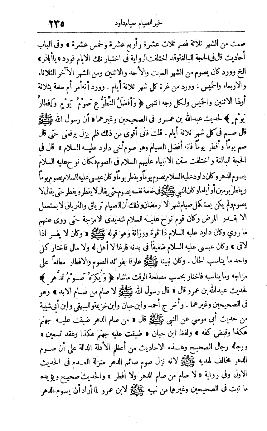 "وأفضل التطوع صوم يوم وإفطار يوم" لحديث عبد الله بن عمرو في الصحيحين وغيرهما أن رسول الله صلى الله عليه وسلم قال: "صم في كل شهر ثلاثة أيام" قلت: فإني أقوى من ذلك فلم يزل يرفعني حتى قال: "صم يوما وأفطر يوما فإنه أفضل الصيام وهو صوم أخي داود عليه السلام". قال في الحجة البالغة: واختلفت سنن الأنبياء عليهم السلام في الصوم فكان نوح عليه السلام يصوم الدهر وكان داود عليه السلام يصوم يوما ويفطر يوما وكان عيسى عليه السلام يصوم يوما ويفطر يومين أو أياما, وكان النبي صلى الله عليه وسلم في خاصة نفسه يصوم حتى يقال لا يفطر ويفطر حتى يقال لا يصوم ولم يكن يستكمل صيام شهر إلا رمضان وذلك أن الصيام ترياق والترياق لا يستعمل إلا بقدر المرض وكان قوم نوح عليه السلام شديدي الأمزجة حتى روي غنهم ما روي, وكان عليه السلام ذا قوة ورزانة وهو قوله صلى الله عليه وسلم. وكان لا يفر إذا لا قي. وكان عيسى عليه السلام ضعيفا في بدنه فارغا لا أهل له ولا مال فاختار كل واحد ما يناسب الحال, وكان نبينا صلى الله عليه وسلم عارفا بفوائد الصوم والإفطار مطلعا على مزاجه وما يناسبه فاختار بحسب مصلحة الوقت ما شاء. ويُكره صوم الدهر لحديث عبد الله بن عمرو قال: قال رسول الله صلى الله عليه وسلم: "لا صام من صام الأبد" وهو في الصحيحين وغيرهما, وأخرج أحمد وابن حبان وابن خزيمة والبيهقي وابن أبي شيبة من حديث أبي موسى عن النبي صلى الله عليه وسلم قال: "من صام الدهر ضُيقت عليه جهنم هكذا وقبض كفه" ولفظ ابن حبان: "ضُيقت عليه جهنم هكذا وعقد تسعين" ورجاله رجال الصحيح, وهذه الأحاديث من أعظم الأدلة الدالة على أن صوم الدهر مخالف لهديه صلى الله عليه وسلم لأنه نزّل صوم صائم الدهر منزلة العدم في الحديث الأول وفي رواية: "لا صام من صام الدهر ولا أفطر" والحديث صحيح, ويؤيده ما ثبت في الصحيحين وغيرهما من نهيه صلى الله عليه وسلم لابن عمرو لما أراد أن يصوم الدهر