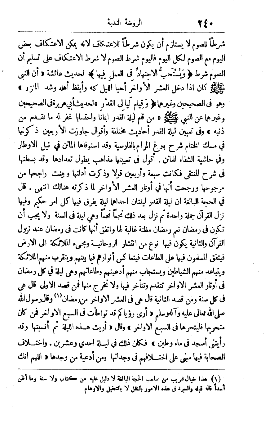 شرطا للصوم لا يسلتزم أن يكون شرطا للاعتكاف لأنه يمكن الاعتكاف بعض اليوم مع الصوم لكل اليوم فاليوم شرط الصوم لا شرط الاعتكاف على تسليم أن الصوم شرط. ويستحب الاجتهاد في العمل فيها لحديث عائشة: أن النبي صلى الله عليه وسلم كان إذا دخل العشر الأواخر أحيا الليل كله وأيقظ أهله وشد المئزر. وهو في الصحيحين وغيرهما. "وقيام ليالي القدر" لحديث أبي هريرة في الصحيحين وغيرهما عن النبي صلى الله عليه وسلم: "من قام ليلة القدر إيمانا واحتسابا غفر له ما تقدم من ذنبه".وفي تعيين ليلة القدر أحاديث مختلفة وأقوال جاوزت الأربعين ذكرتها في مسك الختام شرح بلوغ المرام بالفارسية وقد استوفاها الماتن في نيل الأوطار وفي حاشية الشفاء للماتن. أقول: في تعيينها مذاهب يطول تعدادها وقد بسطتها في شرح المنتقى فكانت سبعة وأربعين قولا وذكرت أدلتها وبينت راجحها من مرجوحها ورحجت أنها في أوتار العشر الأواخر لما ذكرته هنالك انتهى. قال في الحجة البالغة: إن ليلة القدر ليلتان: إحداهما ليلة يفرق فيها كل أمر حكيم وفيها نزل القرآن جملة واحدة ثم نزل بعد ذلك نجما نجما وهي ليلة في السنة ولا يجب أن تكون في رمضان نعم رمضان مظنة غالبة لها واتفق أنها كانت في رمضان عند نزول القرآن والثانية يكون فيها نوع انتشار الروحانية ومجيء الملائكة إلى الأرض فيتفق المسلمون فيها على الطاعات فيتعاكس أنوارهم فيما بينهم ويتقرب منهم الملائكة ويتباعد منهم الشياطين ويستجاب منهم أدعيتهم وطاعاتهم وهي ليلة في كل رمضان في أوتار العشر الأواخر تتقدم وتتأخر فيه ولا تخرج منها فمن قصد الأولى قال: هي في كل سنة ومن قصد الثانية قال: هي في العشر الأواخر من رمضان1, وقال رسول الله صلى الله تعالى عليه وآله وسلم: "أرى رؤياكم قد تواطأت في السبع الأواخر فمن كان متحريها فليتحرها في السبع الأواخر" وقال: "أريت هذه الليلة ثم أنسيتها وقد رأيتني أسجد في ماء وطين" فكان ذلك في ليلة إحدى وعشرين واختلاف الصحابة فيها مبني على اختلافهم في وجدانها, ومن أدعية من وجدها: "اللهم إنك