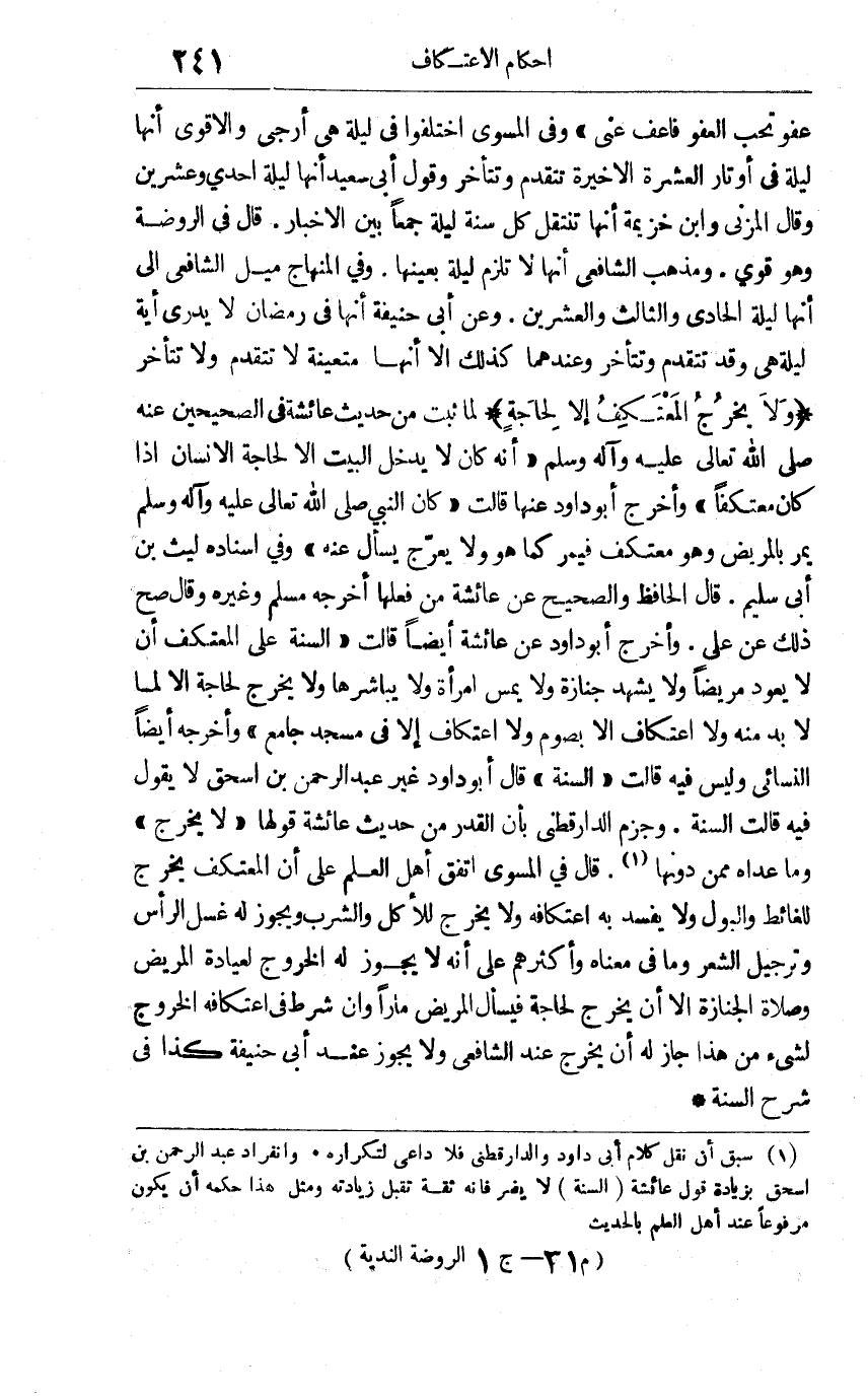عفو تحب العفو فاعف عني". وفي المسوى اختلفوا في ليلة هي أرجى والأقوى أنها ليلة في أوتار العشرة الأخيرة تتقدم وتتأخر وقول أبي سعيد إنها ليلة إحدى وعشرين, وقال المزني وابن خزيمة إنها تنتقل كل سنة ليلة جمعا بين الأخبار. قال في الروضة: وهو قوي ومذهب الشافعي أنها لا تلزم ليلة بعينها وفي المنهاج ميل الشافعي إلى أنها ليلة الحادي والثالث والعشرين وعن أبي حنيفة أنها في رمضان لا يدرى أية ليلة هي وقد تتقدم وتتأخر وعندهما كذلك إلا أنها متعينة لا تتقدم ولا تتأخر. ولا يخرج المعتكف إلا لحاجة لما ثبت من حديث عائشة في الصحيحين عنه صلى الله تعالى عليه وآله وسلم: "أنه كان لا يدخل البيت إلا لحاجة الإنسان إذا كان معتكفا" وأخرج أبو داود عنها قالت: كان النبي صلى الله تعالى عليه وآله وسلم يمر بالمريض وهو معتكف فيمر كما هو ولا يعرج يسأل عنه. وفي إسناده ليث بن أبي سليم. قال الحافظ: والصحيح عن عائشة من فعلها أخرجه مسلم وغيره, وقال صح ذلك عن علي وأخرج أبو داود عن عائشة أيضا قالت: السنة على المعتكف أن لا يعود مريضا ولا يشهد جنازة ولا يمس امرأة ولا يباشرها ولا يخرج لحاجة إلا لما لا بد منه. "ولا اعتكاف إلا بصوم ولا اعتكاف إلا في مسجد جامع" وأخرجه أيضا النسائي وليس فيه قالت: السنة. قال أبو داود: غير عبد الرحمن بن اسحق لا يقول فيه قالت السنة وجزم الدارقطني بأن القدر من حديث عائشة قولها: "لا يخرج" وما عداه ممن دونها1. قال في المسوى: اتفق أهل العلم على أن المعتكف يخرج للغائط والبول ولا يفسد به اعتكافه ولا يخرج للأكل والشرب ويجوز له غسل الرأس وترجيل الشعر وما في معناه, وأكثرهم على أنه لا يجوز له الخروج لعيادة المريض وصلاة الجنازة إلا أن يخرج لحاجة فيسأل المريض مارا وإن شرط في اعتكافه الخروج لشيء من هذا جاز له أن يخرج عند الشافعي ولا يجوز عند أبي حنيفة كذا في شرح السنة.