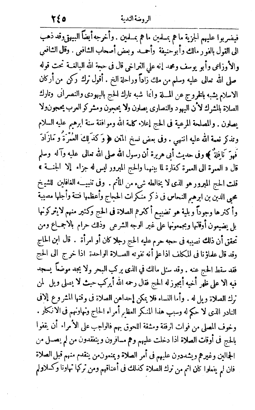 فيضربوا عليهم الجزية ما هم بمسلمين ما هم بمسلمين. وأخرجه أيضا البيهقي, وقد ذهب إلى القول بالفور مالك وأبو حنيفة وأحمد وبعض أصحاب الشافعي, وقال الشافعي والأوزاعي وأبو يوسف ومحمد إنه على التراخي. قال في حجة الله البالغة تحت قوله صلى الله تعالى عليه وسلم: "من ملك زادا وراحلة الخ". أقول: ترك ركن من أركان الإسلام يشبه بالخروج عن الملة وإنما شبه تارك الحج باليهودي والنصراني وتارك الصلاة بالمشرك لأن اليهود والنصارى يصلون ولا يحجون ومشركو العرب يحجون ولا يصلون, والمصلحة المرعية في الحج أعلاه كلمة الله وموافقة سنة إبراهيم عليه السلام وتذكر نعمة الله عليه انتهى. وفي بعض النسخ المتن وذلك العمرة وما زاد فهو نافلة وفي حديث أبي هريرة أن رسول الله صلى الله تعالى عليه وآله وسلم قال: "العمرة إلى العمرة كفارة لما بينهما والحج المبرور ليس له جزاء إلا الجنة". قلت: الحج المبرور هو الذي لا يخالطه شيء من المأثم, وفي تنبيه الغافلين للشيخ محي الدين بن إبراهيم النحاس في ذكر منكرات الحجاج وأعظمها فتنة وأجلها مصيبة وأكثرها وجودا وبلية هو تضييع أكثرهم الصلاة في الحج وكثير منهم لا يتركونها بل يضيعون أوقاتها ويجمعونها على غير الوجه الشرعي, وذلك حرام بالإجماع ومن تحقق أن ذلك نصيبه في حجه حرم عليه الحج رجلا كان أو امرأة. قال ابن الحاج: وقد قال علماؤنا في المكلف: إذا علم أنه تفوته الصلاة الواحدة إذا خرج إلى الحج فقد سقط الحج عنه, وقد سئل مالك في الذي يركب البحر ولا يجد موضعا يسجد فيه إلا على ظهر أخيه أيجوز له الحج؟ فقال رح: أيركب حيث لا يصلي ويل لمن ترك الصلاة ويل له. وأما النساء فلا يمكن إحداهن الصلاة في وقتها المشروع إلا في النادر الذي لا حكم له وسبب هذا المنكر العظيم أمراء الحاج وتهاونهم في الإنكار. وخوف المصلي من فوات الرفقة ومشقة اللحوق بهم فالواجب على الأمراء أن يقفوا بالحج في أوقات الصلاة إذا دخلت عليهم وهم مسافرون ويتفقدون من لم يصل من الجمّالين وغيرهم ويشددون عليهم في أمر الصلاة ويمنعون من يتقدم منهم قبل الصلاة فإن لم يفعلوا كان إثم من ترك الصلاة كذلك في أعناقهم ومن تركها تهاونا وكسلا ولم