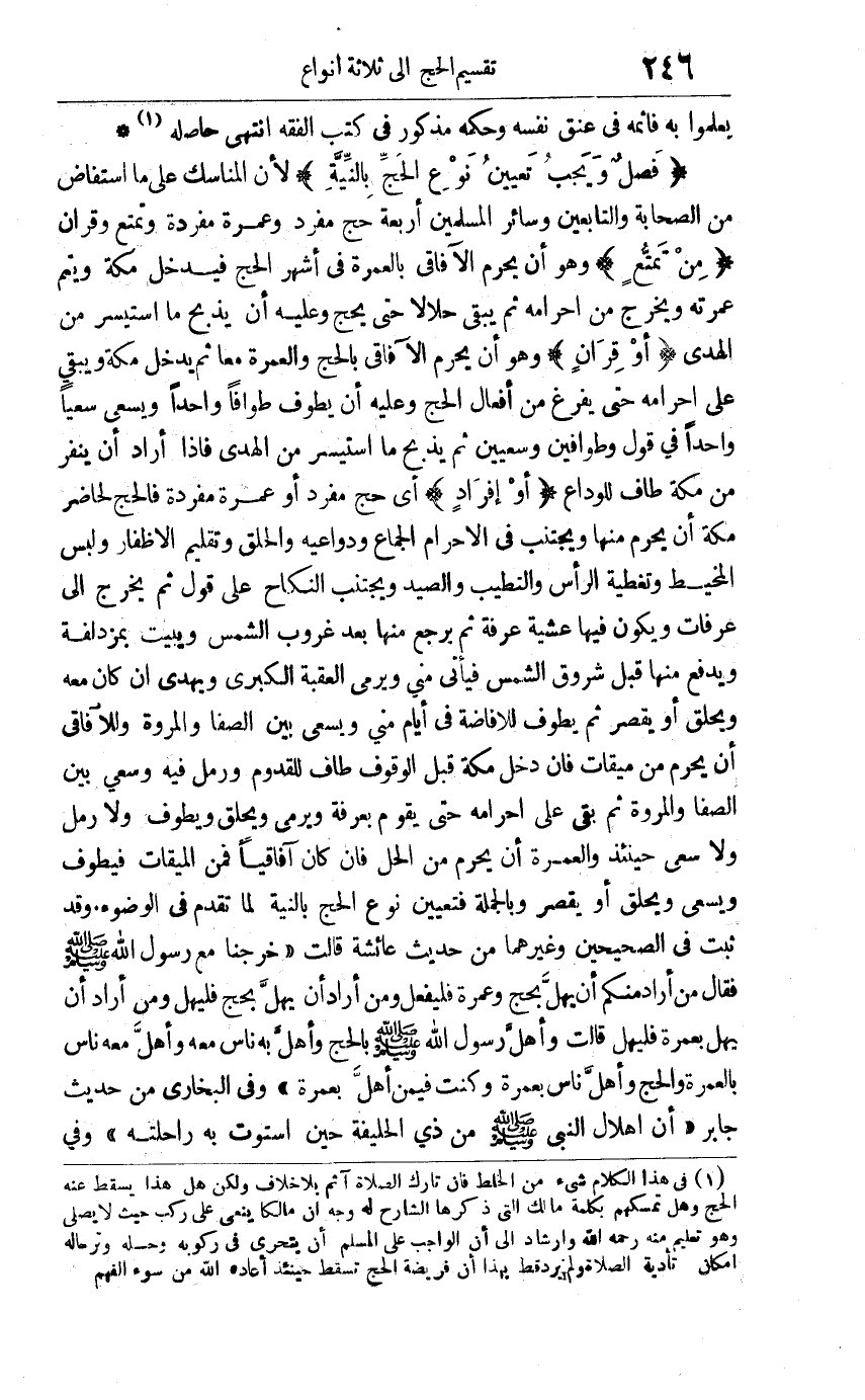 فصل "ويجب تعيين نوع الحج بالنية" لأن المناسك على ما استفاض من الصحابة والتابعين وسائر المسلمين أربعة: حج مفرد وعمرة مفردة وتمتع وقران. "من تمتع" وهو أن يحرم الآفاقي بالعمرة في أشهر الحج فيدخل مكة ويتم عمرته ويخرج من إحرامه ثم يبقى حلالا حتى يحج وعليه أن يذبح ما استيسر من الهدي. أو قران وهو أن يحرم الآفاقي بالحج والعمرة معا ثم يدخل مكة وبيقي على إحرامه حتى يفرغ من أفعال الحج وعليه أن يطوف طوافا واحدا ويسعى سعيا واحدا في قوله وطوافين وسعيين ثم يذبح ما استيسر من الهدي فإذا أراد أن ينفر من مكة طاف للوداع. أو إفراد أي حج مفرد أو عمرة مفردة فالحج لحاضر مكة أن يحرم منها ويجتنب في الإحرام الجماع ودواعيه والحلق وتقليم الأظفار ولبس المخيط وتغطية الرأس والتطيب والصيد ويجتنب النكاح على قول ثم يخرج إلى عرفات ويكون فيها عشية عرفة ثم يرجع منها بعد غروب الشمس ويبيت بمزدلفة ويدفع منها قبل شروق الشمس فيأتي منى ويرمي العقبة الكبرى ويهدي إن كان معه ويحلق أو يقصر ثم يطوف للإفاضة في أيام منى ويسعى بين الصفا والمروة, وللآفاقي أن يحرم من ميقات فإن دخل مكة قبل الوقوف طاف للقدوم ورمل فيه وسعى بين الصفا والمروة ثم بقي على إحرامه حتى يقوم بعرفة ويرمي ويحلق ويطوف ولا رمل ولا سعي حينئذ والعمرة أن يحرم من الحل فإن كان آفاقيا فمن الميقات فيطوف ويسعى ويحلق أو يقصر. وبالجملة: فتعيين نوع الحج بالنية لما تقدم في الوضوء, وقد ثبت في الصحيحين وغيرهما من حديث عائشة قالت: خرجنا مع رسول الله صلى الله عليه وسلم فقال: "من أراد منكم أن يهل بحج وعمرة فليفعل ومن أراد أن يهل بحج فليهل ومن أراد أن يهل بعمرة فليهل". قالت: وأهلّ رسول الله صلى الله عليه وسلم بالحج وأهلّ به ناس معه وأهلّ معه ناس بالعمرة والحج وأهلّ ناس بعمرة وكنت فيمن أهل بعمرة. وفي البخاري من حديث جابر: أن إهلال النبي صلى الله عليه وسلم من ذي الحليفة حين استوت به راحلته. وفي