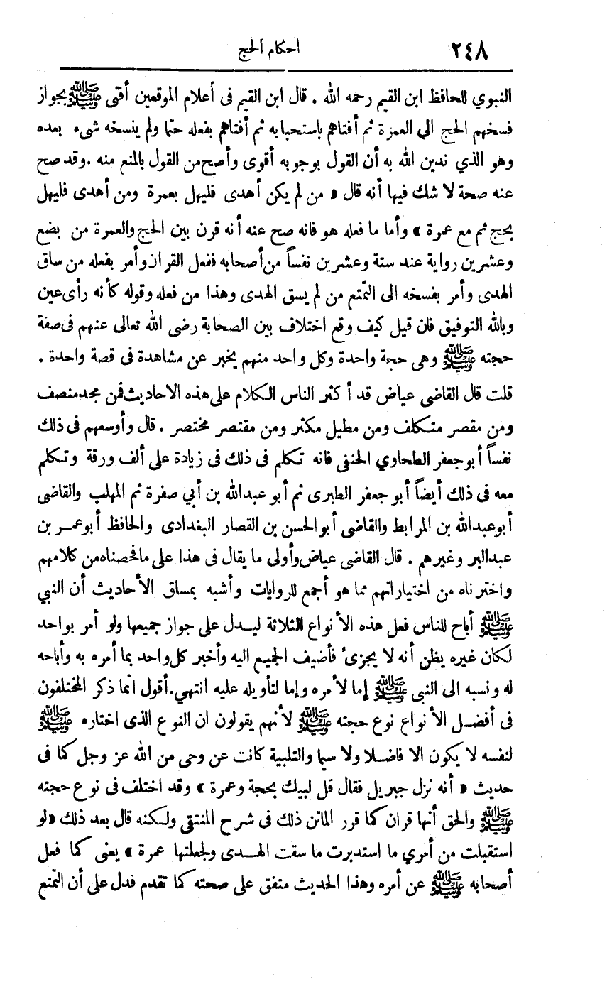 النبوي للحافظ ابن القيم رح. قال ابن القيم في إعلام الموقعين: أفتى صلى الله عليه وسلم بجواز فسخهم الحج إلى العمرة ثم أفتاهم باستحبابه ثم أفتاهم بفعله حتما ولم ينسخه شيء بعده وهو الذي ندين الله به أن القول بوجوبه أقوى وأصح من القول بالمنع منه, وقد صح عنه صحة لا شك فيها أنه قال: "من لم يكن أهدى فليهل بعمرة ومن أهدى فليهل بحج ثم مع عمرة". وأما ما فعله هو فإنه صح عنه أنه قرن بين الحج والعمرة من بضع وعشرين رواية عند ستة وعشرين نفسا من أصحابه ففعل القران وأمر بفعله من ساق الهدي وأمر بفسخه إلى التمتع من لم يسق الهدي, وهذا من فعله وقوله كأنه رأي عين وبالله التوفيق. فإن قيل كيف وقع اختلاف بين الصحابة رضي الله تعالى عنهم في صفة حجته صلى الله عليه وسلم وهي حجة واحدة وكل واحد منهم يخبر عن مشاهدة في قصة واحدة. قلت: قال القاضي عياض: قد أكثر الناس الكلام على هذه الأحاديث فمن مجد منصف ومن مقصر متكلف ومن مطيل مكثر ومن مقتصر مختصر. قال: وأوسعهم في ذلك نفسا أبو جعفر الطحاوي الحنفي فإنه تكلم في ذلك في زيادة على ألف ورقة وتكلم معه في ذلك أيضا أبو جعفر الطبري ثم أبو عبد الله بن أبي صفرة ثم المهلب والقاضي أبو عبد الله بن المرابط والقاضي أبو الحسن بن القصار البغدادي والحافظ أبو عمر بن عبد البر وغيرهم. قال القاضي عياض: وأولى ما يقال في هذا على ما فحصناه من كلامهم واخترناه من اختياراتهم مما هو أجمع للروايات وأشبه بمساق الأحاديث أن النبي صلى الله عليه وسلم أباح للناس فعل هذه الأنواع الثلاثة ليدل على جواز جميعها ولو أمر بواحد لكان غيره يظن أنه لا يجزئ فأضيف الجميع عليه وأخبر كل واحد بما أمره به وأباحه له ونسبه إلى النبي صلى الله عليه وسلم إما لأمره وإما لتأويله عليه انتهى. أقول: إنما ذكر المختلفون في أفضل الأنواع نوع حجته صلى الله عليه وسلم يقولون إن النوع الذي اختاره صلى الله عليه وسلم لنفسه لا يكون إلا فاضلا ولا سيما والتلبية كانت عن وحي من الله عز وجل كما في حديث: أنه نزل جبريل فقال: "قل لبيك بحجة وعمرة" وقد اختلف في نوع حجته صلى الله عليه وسلم والحق أنها قران كما قرر الماتن ذلك في شرح المنتقى ولكنه قال بعد ذلك: "لو استقبلت من أمري ما استدبرت ما سقت الهدي ولجعلتها عمرة" يعني كما فعل أصحابه صلى الله عليه وسلم عن أمره, وهذا الحديث متفق على صحته كما تقدم فدل على أن التمتع