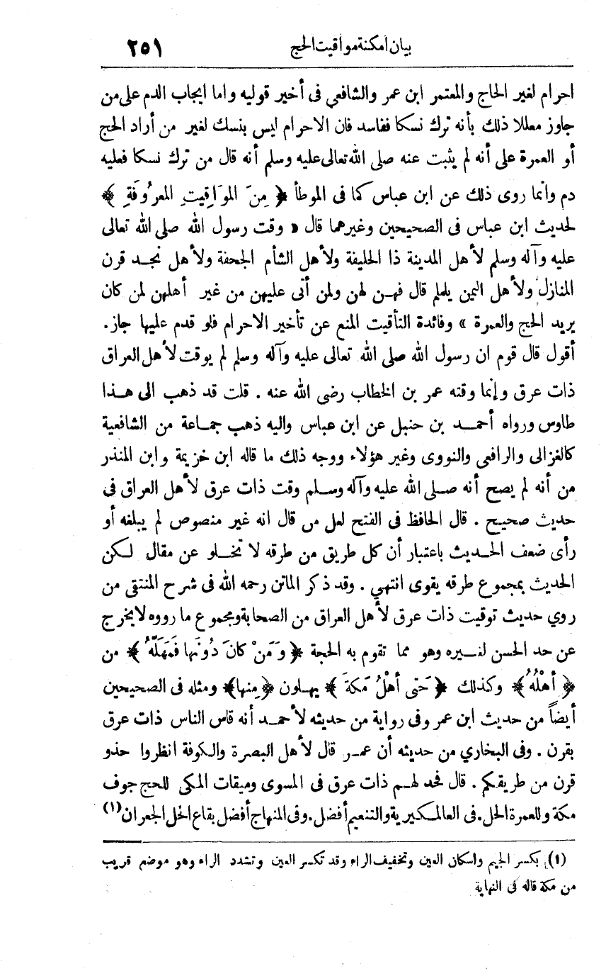 إحرام لغير الحاج والمعتمر ابن عمر والشافعي في أخير قوليه. وأما إيجاب الدم على من جاوز معللا ذلك بأنه ترك نسكا ففاسد فإن الإحرام ليس بنسك لغير من أراد الحج أو العمرة على أنه لم يثبت عنه صلى الله تعالى عليه وسلم أنه قال: من ترك نسكا فعليه دم, وإنما روي ذلك عن ابن عباس كما في الموطأ. "من المواقيت المعروفة" لحديث ابن عباس في الصحيحين وغيرهما قال: وقّت رسول الله صلى الله تعالى عليه وآله وسلم لأهل المدنية ذا الحليفة ولأهل الشام الجحفة ولأهل نجد قرن المنازل ولأهل اليمن يلملم. قال: "فهن لهن ولمن أتى عليهن من غير أهلهن لمن كان يريد الحج والعمرة" وفائدة التأقيت المنع عن تأخير الإحرام فلو قدم عليها جاز. أقول: قال قوم أن رسول الله صلى الله تعالى عليه وآله وسلم لم يوقت لأهل العراق ذات عرق وإنما وقته عمر بن الخطاب رضي الله عنه. قلت: قد ذهب إلى هذا طاوس ورواه أحمد بن حنبل عن ابن عباس وإليه ذهب جماعة من الشافعية كالغزالي والرافعي والنووي وغير هؤلاء ووجه ذلك ما قاله ابن خزيمة وابن المنذر من أنه لم يصح أنه قال صلى الله عليه وآله وسلم: وقّت ذات عرق لأهل العراق في حديث صحيح. قال الحافظ في الفتح: لعل من قال إنه غير منصوص لم يبغله أو رأى ضعف الحديث باعتبار أن كل طريق من طرقه لا تخلو عن مقال لكن الحديث بمجموع طرقه يقوى انتهى. وقد ذكر الماتن رح في شرح المنتقى من روى حديث توقيت ذات عرق لأهل العراق من الصحابة ومجموع ما رووه لا يخرج عن حد الحسن لغيره وهو مما تقوم به الحجة. "ومن كان دونها فمهله" من "أهله" وكذلك "حتى أهل مكة" يهلون "منها" ومثله في الصحيحين أيضا من حديث ابن عمر وفي رواية من حديثه لأحمد أنه قاس الناس ذات عرق بقرن, وفي البخاري من حديثه أن عمر قال لأهل البصرة والكوفة: انظروا حذو قرن من طريقكم قال: فحد لهم ذات عرق. في المسوى وميقات المكي للحج جوف مكة وللعمرة الحل في العالمكيرية والتنعيم أفضل. وفي المنهاج أفضل بقاع الحل الجعران1