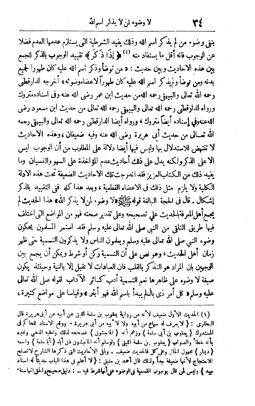 1 الحديث الأول ضعيف لأنه من رواية يعقوب بن سلمة الليثي عن أبيه عن أبي هريرة قال البخاري: لا يعرف له سماع من أبيه ولا لأبيه من أبي هريرة. ووقع الإسناد للحاكم في المستدرك: يعقوب بن أبي سلمة وزعم أنه الماجشون فصححه لذلك وتعقبه الذهبي وغيره بأنه خطأ والصواب يعقوب بن سلمة الليثي ولو سُلّم أنه الماجشون فإن أباه أبا سلمة واسمه دينار مجهول الحال وعلى كل فالحديث ضعيف. وباقي الأحاديث التي ذكرها الشارح لا تصلح للاحتجاج لأنها ضعيفة جداً ولذلك قال أحمد بن حنبل: لا أعلم في هذا الباب حديثاً له إسناد جيد وليس لمن قال بوجوب التسمية في الوضوء على أنها شرط فيه: دليل صحيح والحق أنها سنة.