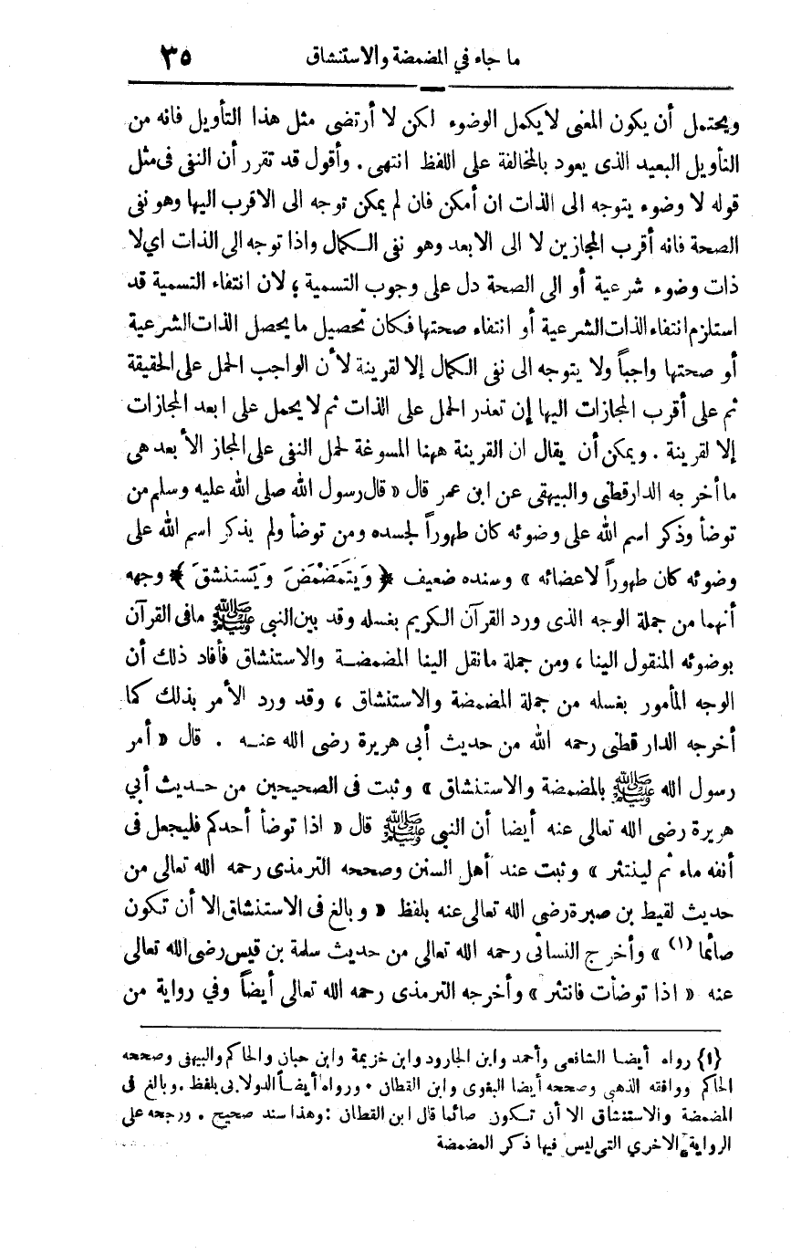 ويحتمل أن يكون المعنى لا يكمل الوضوء لكن لا أرتضي مثل هذا التأويل فإنه من التأويل البعيد الذي يعود بالمخالفة على اللفظ انتهى. وأقول: قد تقرر أن النفي في مثل قوله: "لا وضوء" يتوجه إلى الذات إن أمكن فإن لم يمكن توجه إلى الأقرب إليها وهو نفي الصحة فإنه أقرب المجازيْن لا إلى الأبعد وهو نفي الكمال, وإذا توجه إلى الذات أي لا ذات وضوء شرعية أو إلى الصحة دل على وجوب التسمية لأن انتفاء التسمية قد استلزم انتفاء الذات الشرعية أو انتفاء صحتها فكان تحصيل ما يُحصِّل الذات الشرعية أو صحتها واجباً ولا يتوجه إلا نفي الكمال إلا لقرينة لأن الواجب الحمل على الحقيقة ثم على أقرب المجازات إليها إن تعذر الحمل على الذات ثم لا يحمل على أبعد المجازات إلا لقرينة, ويمكن أن يقال إن القرينة ههنا المسوِّغة لحمل النفي على المجاز الأبعد هي ما أخرجه الدارقطني والبيهقي عن ابن عمر قال: قال رسول الله صلى الله عليه وسلم: "من توضأ وذكر اسم الله على وضوئه كان طهوراً لجسده, ومن توضأ ولم يذكر اسم الله على وضوئه كان طهورا لأعضائه". وس نده ضعيف. "ويتمضمض ويستنشق" وجهه أنهما من جملة الوجه الذي ورد القرآن الكريم بغسله وقد بين النبي صلى الله عليه وسلم ما في القرآن بوضوئه المنقول إلينا ومن جملة ما نقل إلينا المضمضة والاستنشاق فأفاد ذلك أن الوجه المأمور بغلسه من جملة المضمضة والاستنشاق وقد ورد الأمر بذلك كما أخرجه الدارقطني رح من حديث أبي هريرة رضي الله عنه قال: أمر رسول الله صلى الله عليه وسلم بالمضمضة والاستنشاق, وثبت في الصحيحين من حديث أبي هريرة رضي الله تعالى عنه أيضا أن النبي صلى الله عليه وسلم قال: "إذا توضأ أحدكم فليجعل في أنفه ماءً ثم لينتثر". وثبت عند أهل السنن وصححه الترمذي رح تعالى من حديث لقيط بن صبرة رضي الله تعالى عنه بلفظ: "وبالغ في الاستنشاق إلا أن تكون صائما1". وأخرج النسائي رح تعالى من حديث سلمة بن قيس رضي الله تعالى عنه: "إذا توضأت فانتثر" وأخرجه الترمذي رح تعالى أيضا وفي رواية