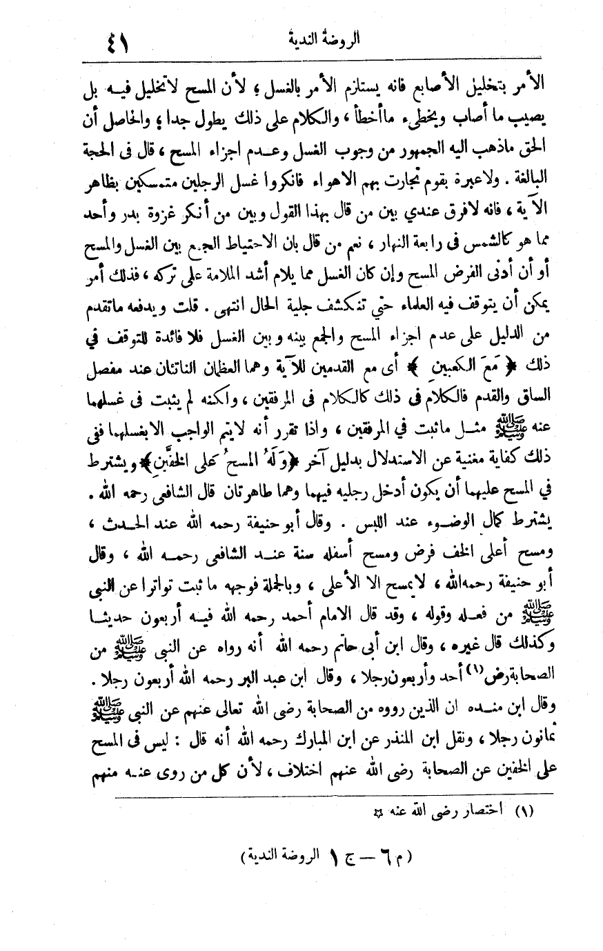 الأمر بتخليل الأصابع فإنه يستلزم الأمر بالغسل؛ لأن المسح لا تخليل فيه بل يصيب ما أصاب ويخطئ ما أخطأ والكلام على ذلك يطول جدا. والحاصل: أن الحق ما ذهب إليه الجمهور من وجوب الغسل وعدم إجزاء المسح. قال في الحجة البالغة: ولا عبرة بقوم تجارت بهم الأهواء فأنكروا غسل الرجلين متمسكين بظاهر الآية فإنه لا فرق عندي بين من قال بهذا القول وبين من أنكر غزوة بدر وأحد مما هو كالشمس في رابعة النهار. نعم من قال بأن الاحتياط الجمع بين الغسل والمسح أو أن أدنى الفرض المسح وإن كان الغسل مما يلام أشد الملامة على تركه فذلك أمر يمكن أن يتوقف فيه العلماء حتى تنكشف جلية الحال انتهى. قلت: ويدفعه ما تقدم من الدليل على عدم إجزاء المسح والجمع بينه وبين الغسل فلا فائدة للتوقف في ذلك مع الكعبين أي مع القدمين للآية هما العظمان الناتئان عند مفصل الساق والقدم, فالكلام في ذلك كالكلام في المرفقين, ولكنه لم يثبت في غسلهما عنه صلى الله عليه وسلم مثل ما ثبت في المرفقين, وإذا تقرر أنه لا يتم الواجب إلا بغلسهما ففي ذلك كفاية مغنية عن الاستدلال بدليل آخر. وله المسح على الخفين ويشترط في المسح عليهما أن يكون أدخل رجليه فيهما وهما طاهرتان. قال الشافعي رح: يشترط كمال الوضوء عند اللبس, وقال أبو حنيفة رح: عند الحدث ومسح أعلى الخف فرض ومسح أسفله سنة عند الشافعي رح, وقال أبو حنيفة رح: لا يمسح إلا الأعلى. وبالجملة: فوجهه ما ثبت تواتراً عن النبي صلى الله عليه وسلم من فعله وقوله, وقد قال الإمام أحمد رح: فيه أربعون حديثا, وكذلك قال غيره وقال ابن أبي حاتم رح: إنه رواه عن النبي صلى الله عليه وسلم من الصحابة رض1 أحد وأربعون رجلا, وقال ابن عبد البر رح: أربعون رجلا. وقال ابن منده: إن الذين رووه من الصحابة رضي الله تعالى عنهم عن النبي صلى الله عليه وسلم ثمانون رجلا, ونقل ابن المنذر عن ابن المبارك رح أنه قال: ليس في المسح على الخفين عن الصحابة رضي الله عنهم اختلاف لأن كل من روى عنه منهم