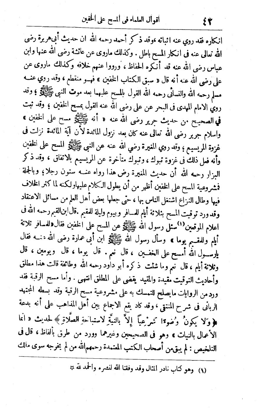 إنكاره فقد روي عنه إثباته وقد ذكر أحمد رح أن حديث أبي هريرة رضي الله تعالى عنه في إنكار المسح باطل, وكذلك ما روي عن عائشة رضي الله عنها وابن عباس رضي الله عنه قد أنكره الحفاظ ورووا عنهم خلافه, وكذلك ما روي عن علي رضي الله عنه أنه قال: سبق الكتاب الخفين. فهو منقطع, وقد روى عنه مسلم رح والنسائي رح القول بالمسح عليهما بعد موت النبي صلى الله عليه وسلم, وقد روى الإمام المهدي في البحر عن علي رضي الله عنه القول بمسخ الخفين, وقد ثبت في الصحيح من حديث جرير رضي الله عنه أنه صلى الله عليه وسلم مسح على الخفين: وإسلام جرير رضي الله تعالى عنه كان بعد نزول المائدة لأن آية المائدة نزلت في غزوة المريسيع, وقد روى المغيرة رضي الله عنه عن النبي صلى الله عليه وسلم المسح على الخفين وأنه فعل ذلك في غزوة تبوك وتبوك متأخرة عن المريسيع بالاتفاق, وقد ذكر البزار رح أن حديث المغيرة رض هذا رواه عنه ستون رجلا, وبالجملة: فمشروعية المسح على الخفين أظهر من أن يطول الكلام عليها ولكنه لما كثر الخلاف فيها وطال النزاع اشتغل الناس بها حتى جعلها بعض أهل العلم من مسائل الاعتقاد, وقد ورد توقيت المسح بثلاثة أيام للمسافر وبيوم وليلة للمقيم. قال ابن القيم رح في إعلام الموقعين1: سئل رسول الله صلى الله عليه وسلم عن المسح على الخفين فقال: "للمسافر ثلاثة أيام وللمقيم يوما" , وسأل رسول الله صلى الله عليه وسلم ابن أبي عمارة رضي الله عنه فقال: يا رسول الله أمسح على الخفين؟ قال: "نعم" قال: يوما. قال: "ويومين" قال: وثلاثة أيام. قال: "نعم وما شئت" ذكره أبو داود رح وطائفة. قالت هذا مطلق أحاديث التوقيت مقيدة والمقيد يقضي على المطلق انتهى وأما مسح الرقبة فقد ورد من الروايات ما يصلح للتمسك به على مشروعية مسح الرقبة وقد بسطه المجتهد الرباني في شرح المنتقى وقد كاد يقع الإجماع بين أهل المذاهب على أنه بدعة, "ولا يكون وضوءا شرعيا إلا بالنية لاستباحة الصلاة" لحديث: "إنما الأعمال بالنيات" وهو في الصحيحين وغيرهما, وورد من طرق بألفاظ قال في التلخيص: لم يبق من أصحاب الكتب المعتمدة رحمهم الله من لم يخرجه سوى مالك