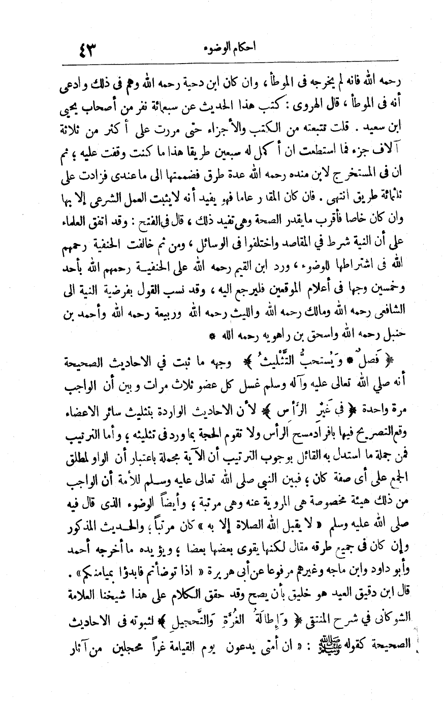 رح فإنه لم يخرجه في الموطأ وإن كان ابن دحية رح وهم في ذلك وادعى أنه في الموطأ. قال الهروي: كتب هذا الحديث عن سبعمائة نفر من أصحاب يحيى بن سعيد قلت: تتبعته من الكتب والأجزاء حتى مررت على أكثر من ثلاثة آلاف جزء فما استطعت أن أكمل له سبعين طريقا, هذا ما كنت وقفت عليه ثم إن في المستخرج لابن منده رح عدة طرق فضممتها إلى ما عندي فزادت على ثلثمائة طريق انتهى. فإن كان المقدر عاما فهو يفيد أنه لا يثبت العمل الشرعي إلا بها وإن كان خاصا فأقرب ما يقدر الصحة وهي تفيد ذلك. قال في الفتح: وقد اتفق العلماء على أن النية شرط في المقاصد, واختلفوا في الوسائل ومن ثم خالفت الحنفية رحمهم الله في اشتراطها للوضوء, ورد ابن القيم رح على الحنفية رحمهم الله بأحد وخمسين وجها في إعلام الموقعين فليرجع إليه, وقد نسب القول بفرضية النية إلى الشافعي رح ومالك رح والليث رح وربيعة رح وأحمد بن حنبل رح وإسحق بن راهوية رح. .