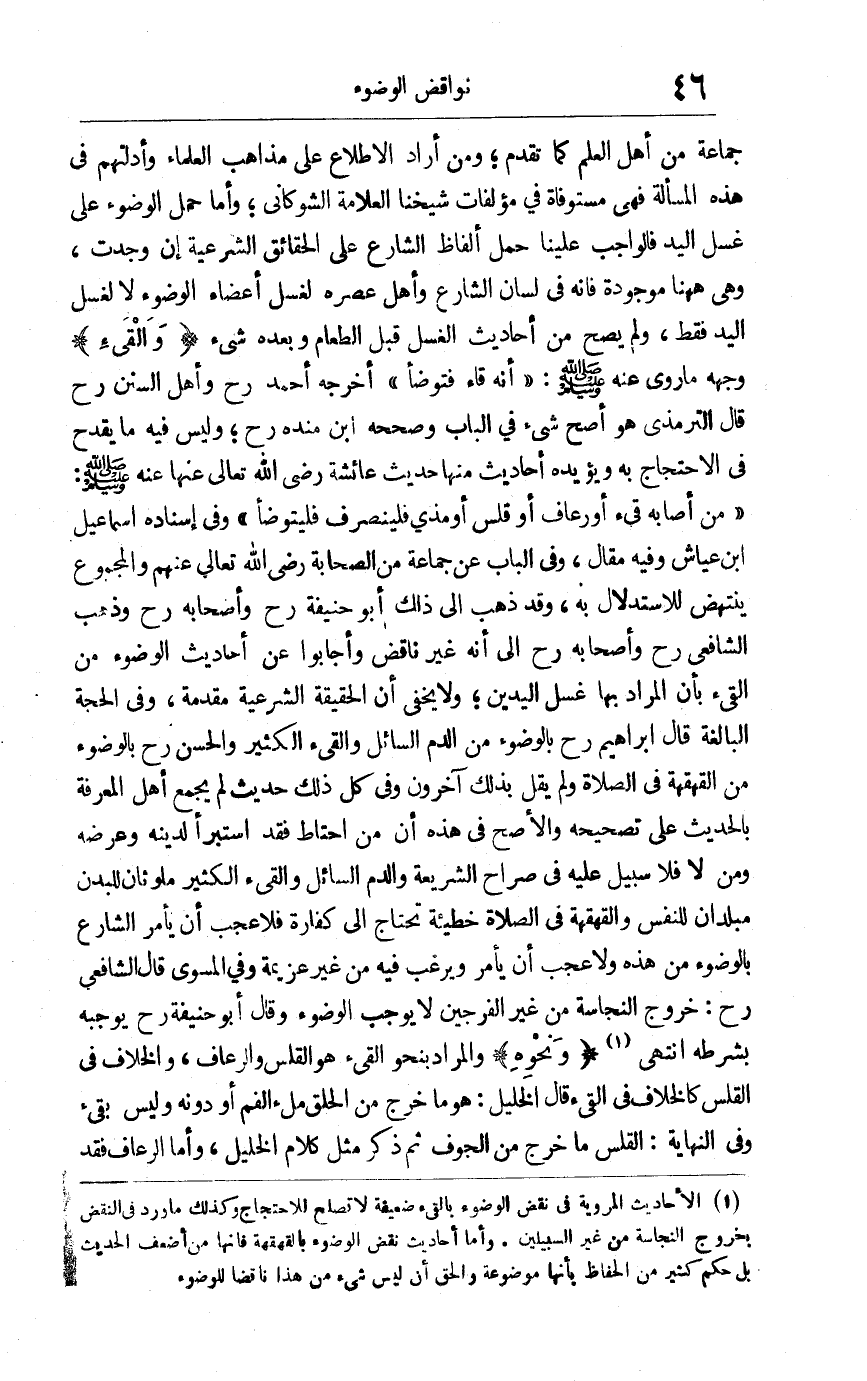 1 الأحاديث المروية في نقض الوضوء بالقيء ضعيفة لا تصلح للاحتجاج وكذلك ما ورد في النقض بخروج النجاسة من غير السبيلين. وأما أحاديث نقض الوضوء بالقهقهة فإنها من أضعف الحديث بل حكم كثير من الحفاظ بأنها موضوعة والحق أن ليس شيء من هذا ناقضا للوضوء.