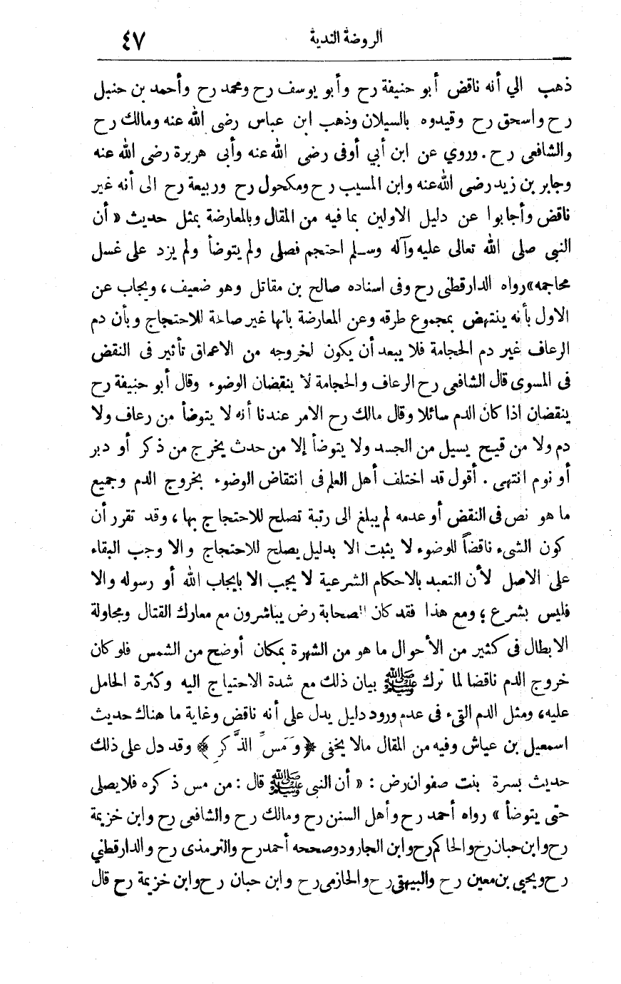 ذهب إلى أنه ناقض أبو حنيفة رح وأبو يوسف رح ومحمد رح وأحمد بن حنبل رح واسحق رح وقيدوه بالسيلان, وذهب ابن عباس رضي الله عنه ومالك رح والشافعي رح وروي عن ابن أبي أوفى رضي الله عنه وأبي هريرة رضي الله عنه وجابر بن زيد رضي الله عنه وابن المسيب رح ومكحول رح وربيعة رح إلى أنه غير ناقض وأجابوا عن دليل الأولين بما فيه من المقال وبالمعارضة بمثل حديث أن النبي صلى الله تعالى عليه وآله وسلم احتجم فصلى ولم يتوضأ ولم يزد على غسل محاجمه. رواه الدارقطني رح وفي إسناده صالح بن مقاتل وهو ضعيف ويُجاب عن الأول بأنه ينتهض بمجموع طرقه وعن المعارضة بأنها غير صالحة للاحتجاج وبأن دم الرعاف غير دم الحجامة فلا يبعد أن يكون لخروجه من الأعماق تأثير في النقض في المسوى. قال الشافعي رح: الرعاف والحجامة لا ينقضان الوضوء. وقال أبو حنيفة رح: ينقضان إذا كان الدم سائلاً وقال مالك رح: الأمر عندنا أنه لا يتوضأ من رعاف ولا دم ولا من قيح يسيل من الجسد ولا يتوضأ إلا من حدث يخرج من ذكر أو دبر أو نوم انتهى. أقول: قد اختلف أهل العلم في انتقاض الوضوء بخروج الدم وجميع ما هو نص في النقض أو عدمه لم يبلغ إلى رتبة تصلح للاحتجاج بها وقد تقرر أن كون الشيء ناقضاً للوضوء لا يثبت إلا بدليل يصلح للاحتجاج وإلا وجب البقاء على الأصل لأن التعبد بالأحكام الشرعية لا يجب إلا بإيجاب الله أو رسوله وإلا فليس بشرع ومع هذا فقد كان الصحابة رض يباشرون مع معارك القتال ومجاولة الأبطال في كثير من الأحوال ماهو من الشهرة بمكان أوضح من الشمس فلو كان خروج الدم ناقضاً لما ترك صلى الله عليه بيان ذلك مع شدة الاحتياج إليه وكثرة الحامل عليه, ومثل الدم القيء في عدم ورود دليل يدل على أنه ناقض وغاية ما هناك حديث إسماعيل بن عياش وفيه من المقال ما لا يخفى. "ومس الذكر", وقد دل على ذلك حديث بسرة بنت صفوان رض: أن النبي صلى الله عليه وسلم قال: "من مس ذكره فلا يصلي حتى يتوضأ" رواه أحمد رح وأهل السنن رح ومالك رح والشافعي رح وابن خزيمة رح وابن حبان رح والحاكم رح وابن الجارود وصححه أحمد رح والترمذي رح والدارقطني رح ويحيى بن معين رح والبيهقي رح والحازمي رح وابن حبان رح وابن خزيمة رح. قال