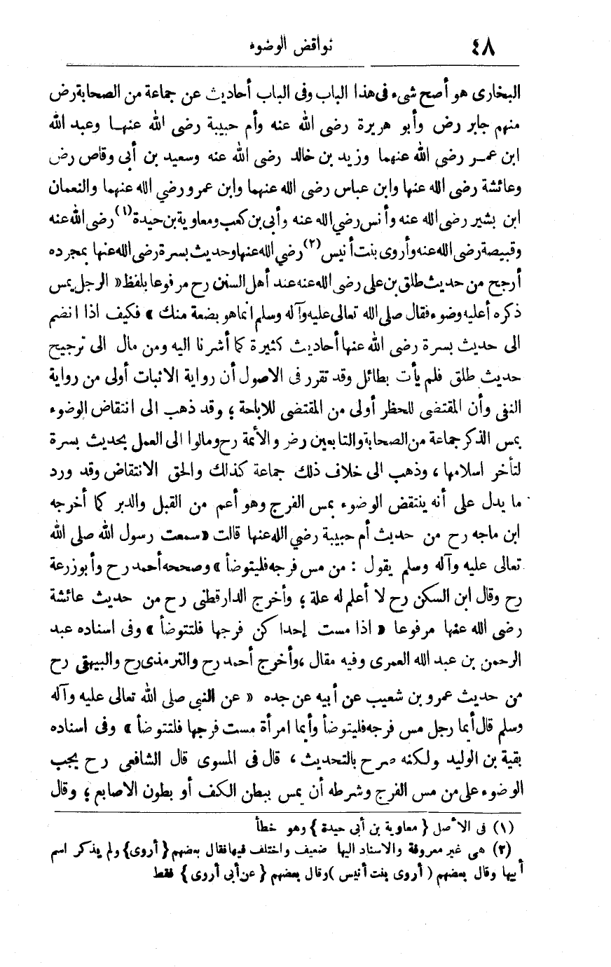 البخاري: هو أصح شيء في هذا الباب, وفي الباب أحاديث عن جماعة من الصحابة رض منهم جابر رض وأبو هريرة رضي الله عنه وأم حبيبة رضي الله عنها وعبد الله ابن عمر رضي الله عنهما وزيد بن خالد رضي الله عنه وسعيد بن أبي وقاص رض وعائشة رضي الله عنها وابن عباس رضي الله عنهما وابن عمرو رضي الله عنهما والنعمان ابن بشير رضي الله عنه وأنس رضي الله عنه وأبي بن كعب ومعاوية بن حيدة1 رضي الله عنه وقبيصة رضي الله عنه وأروى بنت أُنيس2 رضي الله عنها وحديث بسرة رضي الله عنها بمجرده أرجح من حديث طلْق بن علي رضي الله عنه عند أهل السنن رح مرفوعاً بلفظ: الرجل يمس ذكره أعليه وضوء؟ فقال صلى الله تعالى عليه وآله وسلم: "إنما هو بضعة منك" فكيف إذا انضم إلى حديث بسرة رضي الله عنها أحاديث كثيرة كما أشرنا إليه ومن مال إلى ترجيح حديث طلق فلم يأت بطائل وقد تقرر في الأصول أن رواية الإثبات أولى من رواية النفي وأن المقتضي للحظر أولى من المقتضي للإباحة, وقد ذهب إلى انتقاض الوضوء بمس الذكر جماعة من الصحابة والتابعين رض والأئمة رح ومالوا إلى العمل بحديث بسرة لتأخر إسلامها, وذهب إلى خلاف ذلك جماعة كذلك والحق الانتقاض. وقد ورد ما يدل على أنه ينتقض الوضوء بمس الفرج وهو أعم من القُبُل والدُبُر كما أخرجه ابن ماجه رح من حديث أم حبيبة رضي الله عنها قالت: سمعت رسول الله صلى الله تعالى عليه وآله وسلم يقول: "من مس فرجه فليتوضأ" وصححه أحمد رح وأبو زرعة رح وقال ابن السكن رح: لا أعلم له علة, وأخرج الدارقطني رح من حديث عائشة رضي الله عنها مرفوعاً: "إذا مسّت إحداكن فرجها فلتتوضأ" وفي إسناده عبد الرحمن بن عبد الله العمري وفيه مقال. وأخرج أحمد رح والترمذي رح والبيهقي رح من حديث عمرو بن شعيب عن أبيه عن جده عن النبي صلى الله تعالى عليه وآله وسلم قال: "أيما رجل مس فرجه فليتوضأ وأيما امرأة مست فرجها فلتتوضأ" وفي إسناده بقية بن الوليد ولكنه صرح بالتحديث. قال في المسوى قال الشافعي رح: يجب الوضوء على من مس الفرج وشرطه أن يمس ببطن الكف أو بطون الأصابع, وقال