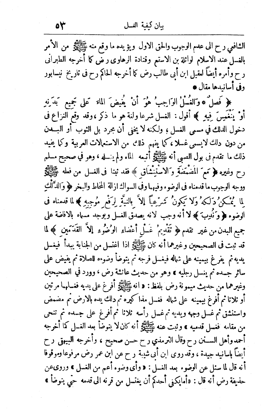 فصل "والغسل الواجب هو أن يُفيض الماء على جميع بدنه أو ينغمس فيه" أقول: الغسل شرعاً ولغة هو ما ذُكر وقد وقع النزاع في دخول الدلك في مسمى الغسل ولكنه لا يخفى أن مجرد بل الثوب أو البدن من دون دلك لا يسمى غسلاً كما يفهم ذلك من الاستعمالات العربية وكما يفيد ذلك ما تقدم في بول الصبي أنه صلى الله عليه وسلم أتبعه الماء ولم يغسله وهو في صحيح مسلم رح وغيره, مع المضمضة والاستنشاق فقد ثبتا في الغسل من فعله صلى الله عليه وسلم ووجه الوجوب ما قدمناه في الوضوء وفيهما وفي السواك إزالة المخاط والبَخر "والدلك لما يمكن دلكه ولا يكون شرعيا إلا بالنية لرفع موجبه" لما قدمناه في الوضوء, "ونُدب" لا أنه وجب لأنه يصدق الغسل ويوجد مسماه بالإفاضة على جميع البدن من غير تقدم, "تقديم غسل أعضاء الوضوء إلا القدمين" لما قد ثبت في الصحيحين وغيرهما أنه كان صلى الله عليه وسلم إذا اغتسل من الجنابة يبدأ فيغسل يديه ثم يفرغ بيمينه على شماله فيغسل فرجه ثم يتوضأ وضوءه للصلاة ثم يفيض على سائر جسده ثم يغسل رجليه, وهو من حديث عائشة رض وورد في الصحيحين وغيرهما من حديث ميمونة رض بلفظ: أنه صلى الله عليه وسلم أفرغ على يديه فغسلهما مرتين أو ثلاثاً ثم أفرغ بيمينه على شماله فغسل مذاكيره ثم دلك يده بالأرض ثم مضمض واستنشق ثم غسل وجهه ويديه ثم غسل رأسه ثلاثاً ثم أفرغ على جسده ثم تنحى من مقامه فغسل قدميه, وثبت عنه صلى الله عليه وسلم أنه كان لا يتوضأ بعد غسل كما أخرجه أحمد وأهل السنن رح وقال الترمذي رح: حسن صحيح, وأخرجه البيهقي رح أيضا بأسانيد جيدة وقد روى ابن أبي شيبة رح عن ابن عمر رض مرفوعاً وموقوفاً أنه قال لما سئل عن الوضوء بعد الغسل: وأي وضوء أعم من الغسل, وروي عن حذيفة رض أنه قال: "أما يكفي أحدكم أن يغتسل من قرنه إلى قدمه حتى يتوضأ".