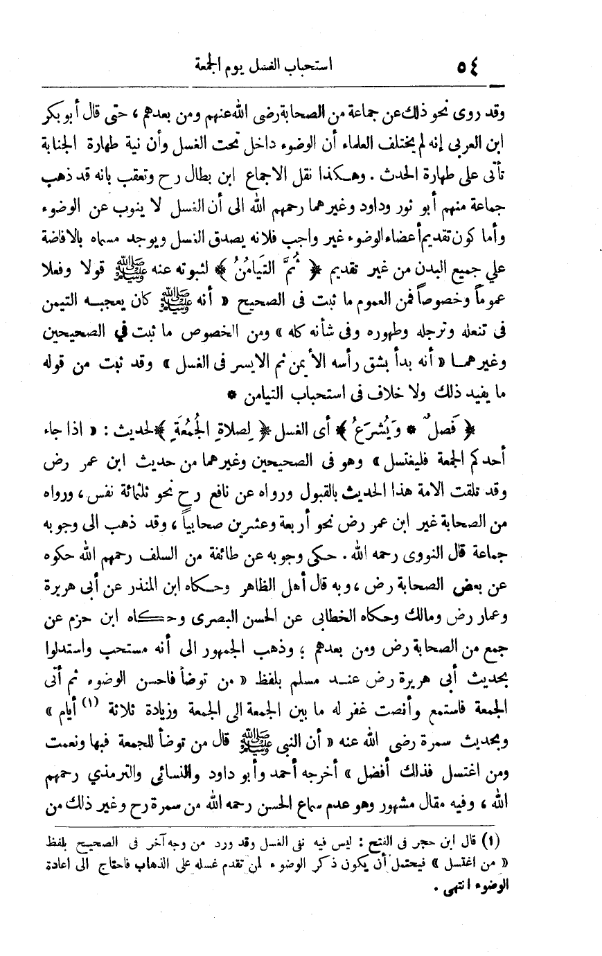 فصل "ويُشرع" أي الغسل "لصلاة الجمعة" لحديث: "إذا جاء أحد كم الجمعة فليغتسل" وهو في الصحيحين وغيرهما من حديث ابن عمر رض وقد تلقت الأمة هذا الحديث بالقبول ورواه عن نافع رح نحو ثلاثمائة نفس, ورواه من الصحابة غير ابن عمر رض نحو أربعة وعشرين صحابياً, وقد ذهب إلى وجوبه جماعة. قال النووي رح: حُكي وجوبه عن طائفة من السلف رحمهم الله حكوه عن بعض الصحابة رض وبه قال أهل الظاهر وحكاه ابن المنذر عن أبي هريرة وعمار رض ومالك وحكاه الخطابي عن الحسن البصري وحكاه ابن حزم عن جمع من الصحابة رض ومن بعدهم, وذهب الجمهور إلى أنه مستحب واستدلوا بحديث أبي هريرة رض عند مسلم بلفظ: "من توضأ فأحسن الوضوء ثم أتى الجمعة فاستمع وأنصت غفر له ما بين الجمعة إلى الجمعة وزيادة ثلاثة أيام1" وبحديث سمرة رضي الله عنه أن النبي صلى الله وسلم عليه قال: "من توضأ للجمعة فبها ونِعمت ومن اغتسل فذلك أفضل" أخرجه أحمد وأبو داود والنسائي والترمذي رحمهم الله وفيه مقال مشهور وهو عدم سماع الحسن رح من سمرة رح وغير ذلك من