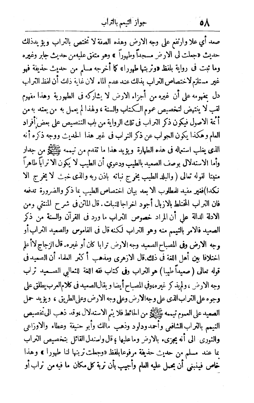 صعد أي علا وارتفع على وجه الأرض وهذه الصفة لا تختص بالتراب ويؤيد ذلك حديث: "جُعلت لي الأرض مسجداً وطهوراً" وهو متفق عليه من حديث جابر وغيره, وما ثبت في رواية بلفظ: "وتربتها طهوراً" كما أخرجه مسلم من حديث حذيفة فهو غير مستلزم لاختصاص التراب بذلك عند عدم الماء لأن غاية ذلك أن لفظ التراب دل بمفهومه أن غيره من أجزاء الأرض لا يشاركه في الطهورية وهذا مفهوم لقب لا ينتهض لتخصيص عموم الكتاب والسنة ولهذا لم يعمل به من يعتد به من أئمة الأصول فيكون ذكر التراب في تلك الرواية من باب التنصيص على بعض أفراد العام وهكذا يكون الجواب عن ذكر التراب في غير هذا الحديث ووجه ذكره أنه الذي يغلب استعماله في هذه الطهارة, ويؤيد هذا ما تقدم من تيممه صلى الله وسلم عليه من جدار. وأما الاستدلال بوصف الصعيد بالطيب ودعوى أن الطيب لا يكون إلا تراباً طاهراً منبتاً لقوله تعالى: {وَالْبَلَدُ الطَّيِّبُ يَخْرُجُ نَبَاتُهُ بِإِذْنِ رَبِّهِ وَالَّذِي خَبُثَ لا يَخْرُجُ إِلَّا نَكِداً} فغير مفيد للمطلوب إلا بعد بيان اختصاص الطيب بما ذُكر, والضرورة تدفعه فإن التراب المختلط بالأزبال أجود إخراجاً للنبات قال الماتن في شرح المنتقى: ومن الأدلة الدالة على أن المراد خصوص التراب ما ورد في القرآن والسنة من ذكر الصعيد فالأمر بالتيمم منه وهو التراب لكنه قال في القاموس: والصعيد التراب أو وجه الأرض, وفي المصباح: الصعيد وجه الأرض تراباً كان أو غيره. قال الزجاج لا أعلم اختلافا بين أهل اللغة في ذلك. قال الأزهري: ومذهب أكثر العلماء أن الصعيد في قوله تعالى: {صَعِيداً طَيِّباً} هو التراب. وفي كتاب فقه اللغة للثعالبي: الصعيد تراب وجه الأرض ولم يذكر غيره وفي المصباح أيضا ويقال الصعيد في كلام العرب يطلق على وجوه على التراب الذي على وجه الأرض وعلى وجه الأرض وعلى الطريق, ويؤيد حمل الصعيد على العموم تيممه صلى الله وسلم عليه من الحائط فلا يتم الاستدلال وقد ذهب إلى تخصيص التيمم بالتراب الشافعي وأحمد وداود, وذهب مالك وأبو حنيفة وعطاء والأوزاعي والثوري إلى أنه يجزئ بالأرض وما عليها قال: واستدل القائل بتخصيص التراب بما عند مسلم من حديث حذيفة مرفوعاً بلفظ: "وجُعلت تربتها لنا طهوراً" وهذا خاص فينبغي أن يُحمل عليه العام, وأجيب بأن تربة كل مكان ما فيه من تراب أو