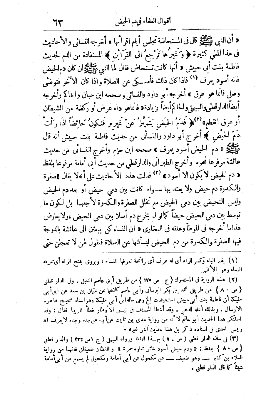 3 في سنن الدارقطني ص80 بهذا اللفظ ورواه البيهقي ج 1 ص 326 والدارقطني ص 80 بلفظ: "ودم حيض أسود خاثر تعلوه حمرة" واللفظان ضعيفان فإنهما من رواية العلاء بن كثير وهو ضعيف عن مكحول عن أبي أمامة ومكحول لم يسمع من أبي أمامة شيئا كما قال الدارقطني.