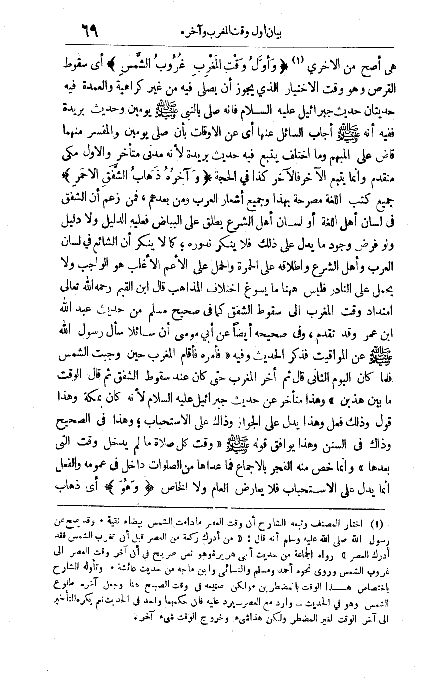 1 اختار المصنف وتبعه الشارح أن وقت العصر ما دامت الشمس بيضاء نقية. وقد صح عن رسول الله صلى الله عليه وسلم أنه قال: "من أدرك ركعة من العصر قبل أن تغرب الشمس فقد أدرك العصر" رواه الجماعة من حديث أبي هريرة وهو نص صريح في أن آخر وقت العصر إلى غروب الشمس وروى نحوه أحمد ومسلم والنسائي وابن ماجه من حديث عائشة. وتأوله الشارح باختصاص هذا الوقت بالمضطرين ولكن صنيعه في وقت الصبح هنا وجعل آخره طلوع الشمس وهو في الحديث وارد مع العصر يرد عليه فإن حكمها واحد في الحديث نعم يُكره التأخير إلى الوقت لغير المضطر ولكن هذا شيء وخروج الوقت شيء آخر.