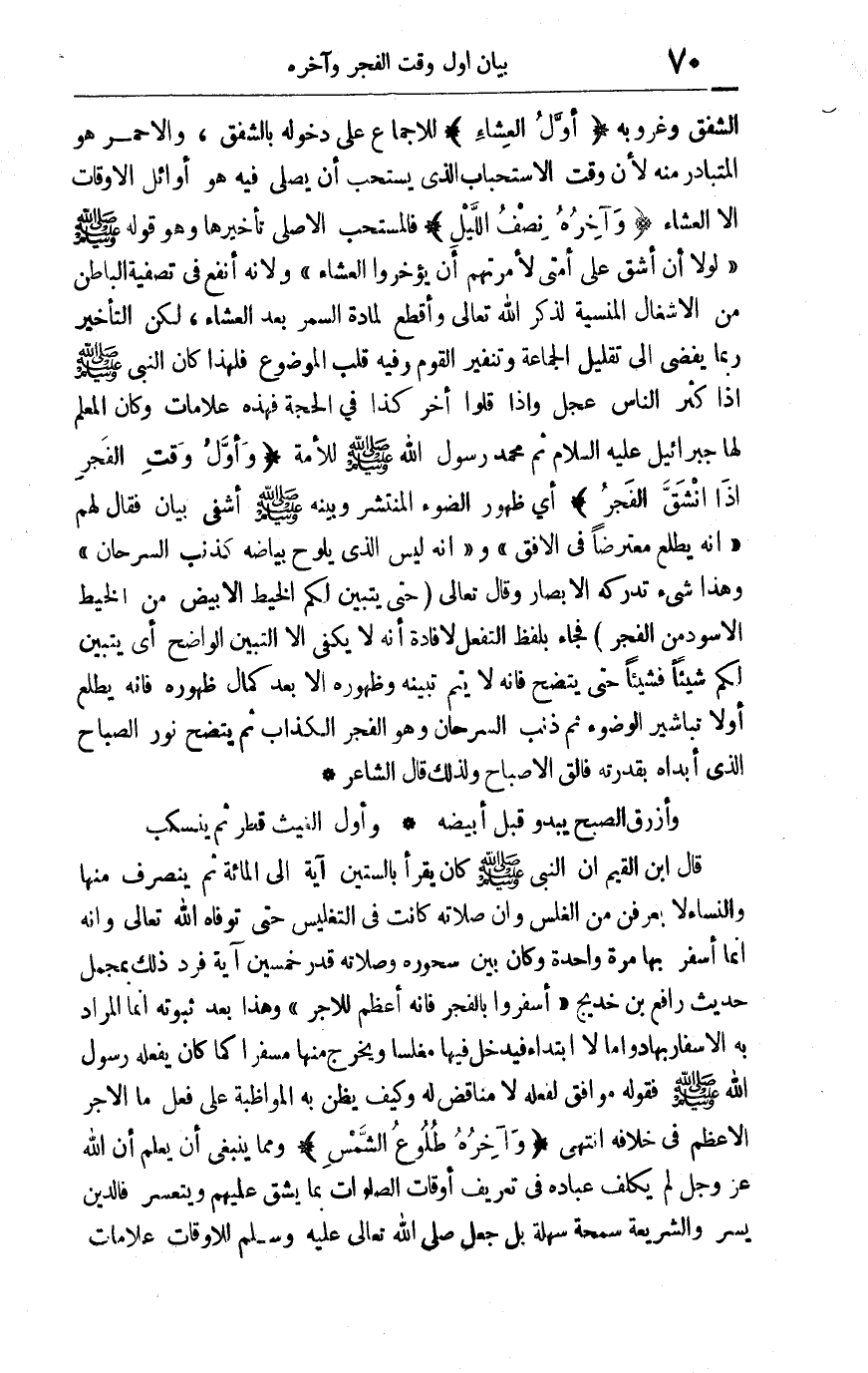 قال ابن القيم: إن النبي صلى الله وسلم عليه كان يقرأ بالستين آية إلى المائة ثم ينصرف منها والنساء لا يُعرفن من الغلس وأن صلاته كانت في التغليس حتى توفاه الله تعالى وأنه إنما أسفر بها مرة واحدة وكان بين سحوره وصلاته قدر خمسين آية فرُد ذلك بمجمل حديث رافع بن خديج: "أسفروا بالفجر فإنه أعظم للأجر" وهذا بعد ثبوته إنما المراد به الإسفار بها دواماً لا ابتداء فيدخل فيها مغلسا ويخرج منها مسفرا كما كان يفعله رسول الله صلى الله وسلم عليه فقوله موافق لفعله لا مناقض له وكيف يُظن به المواظبة على فعل ما الأجر الأعظم في خلافه انتهى. "وآخره طلوع الشمس" ومما ينبغي أن يُعلم أن الله عز وجل لم يكلف عباده في تعريف أوقات الصلوات بما يشق عليهم ويتعسر فالدين يسر والشريعة سمحة سهلة بل جعل صلى الله تعالى عليه وسلم للأوقات علامات
