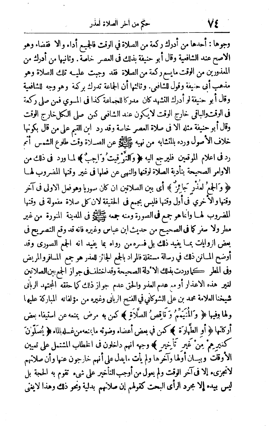 وجوها: أحدها من أدرك ركعة من الصلاة في الوقت فالجميع أداء وإلا فقضاء وهو الأصح عند الشافعية وقال أبو حنيفة بذلك في العصر خاصة وثانيها من أدرك من المعذورين من الوقت ما يسع ركعة من الصلاة فقد وجبت عليه تلك الصلاة وهو مذهب أبي حنيفة وقول للشافعي وثالثها أن الجماعة تدرك بركعة وهو وجه للشافعية وقال أبو حنيفة: لو أدرك التشهد كان مدركاً للجماعة كذا في المسوى فمن صلى ركعة في الوقت والباقي خارج الوقت لا يكون عند الشافعي كمن صلى الكل خارج الوقت: وقال أبو حنيفة مثله إلا في صلاة العصر خاصة وقد رد ابن القيم على من قال بكونها خلاف الأصول ورده بالمتشابه من نهيه صلى الله وسلم عليه عن الصلاة وقت طلوع الشمس أتم رد في إعلام الموقعين فليرجع إليه. "والتوقيت واجب" لما ورد في ذلك من الأوامر الصحيحة بتأدية الصلاة لوقتها والنهي عن فعلها في غير وقتها المضروب لها. "والجمع لعذر جائز" أي بين الصلاتين إن كان صورياً وهو فعل الأولى في آخر وقتها والأخرى في أول وقتها فليس بجمع في الحقيقة لأن كل صلاة مفعولة في وقتها المضروب لها وإنما هو جمع الصورة ومنه جمعه صلى الله وسلم عليه في المدينة المنورة من غير مطر ولا سفر كما في الصحيح من حديث ابن عباس وغيره فإنه قد وقع التصريح في بعض الروايات بما يفيد ذلك بل فسره من رواه بما يفيد أنه الجمع الصوري وقد أوضح الماتن ذلك في رسالة مستقلة فالمراد بالجمع الجائز للعذر هو جمع المسافر والمريض وفي المطر كما وردت بذلك الأدلة الصحيحة وقد اختلف في جواز الجمع بين الصلاتين لغير هذه الأعذار أو مع عدم العذر والحق عدم جواز ذلك كما حققه المجتهد الرباني شيخنا العلامة محمد بن علي الشوكاني في الفتح الرباني وغيره من مؤلفاته المباركة عليها ولها وفيها. "والمتيمم وناقص الصلاة" كمن به مرض يمنعه عن استيفاء بعض أركانها "أو الطهارة" كمن في بعض أعضاء وضوئه ما يمنعه من غسله بالماء, "يصلون كغيرهم من غير تأخير" وجهه أنهم داخلون في الخطاب المشتمل على تعيين الأوقات وبيان أولها وآخرها ولم يأت ما يدل على أنهم خارجون عنها وأن صلاتهم لا تجزيء إلا في آخر الوقت ولم يعول من أوجب التأخير على شيء تقوم به الحجة بل ليس بيده إلا مجرد الرأي البحت كقولهم إن صلاتهم بدلية ونحو ذلك وهذا لا يغني