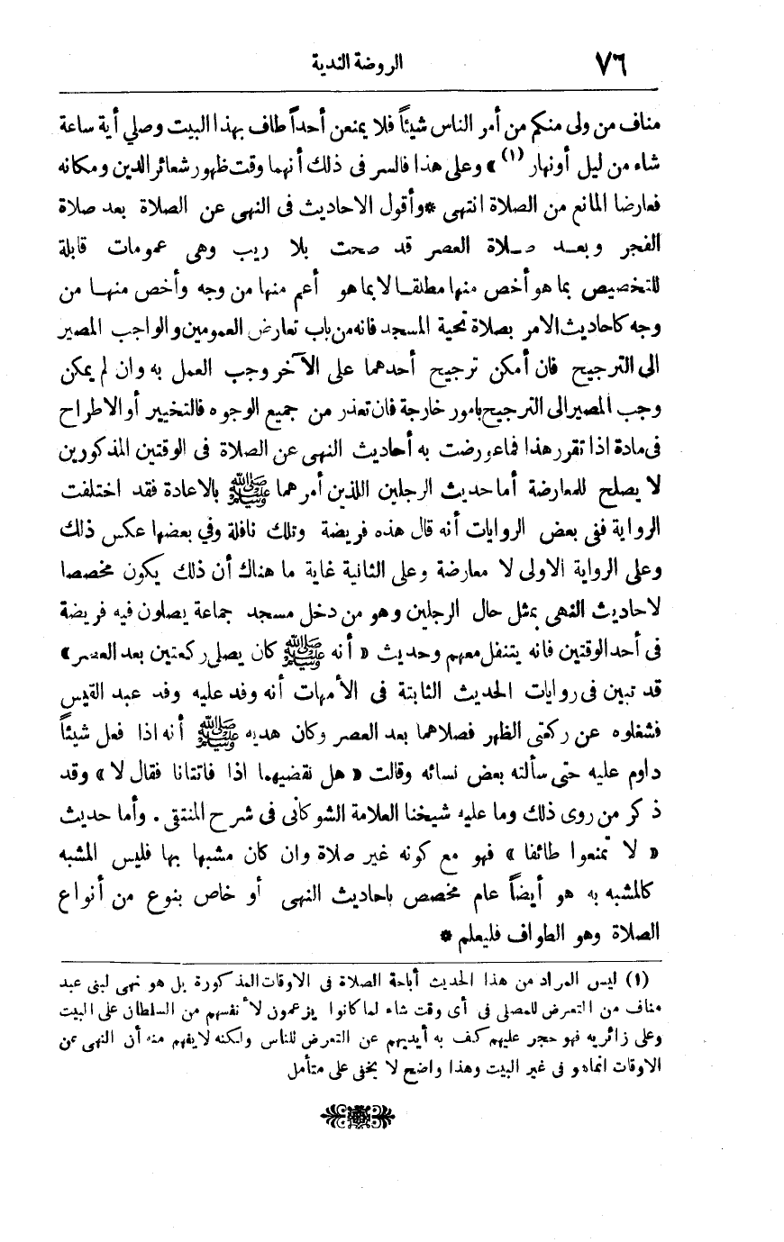 1 ليس المراد من هذا الحديث إباحة الصلاة في الأوقات المذكورة بل هو نهي لبني عبد مناف من التعرض للمصلي في أي وقت شاء لما كانوا يزعمون لأنهم من السلطان على البيت وعلى زائريه فهو حَجْر عليهم كفّ به أيديهم عن التعرض للناس ولكنه لا يُفهم منه أن النهي عن الأوقات إنما هو في غير البيت وهذا واضح لا يخفى على متأمل.