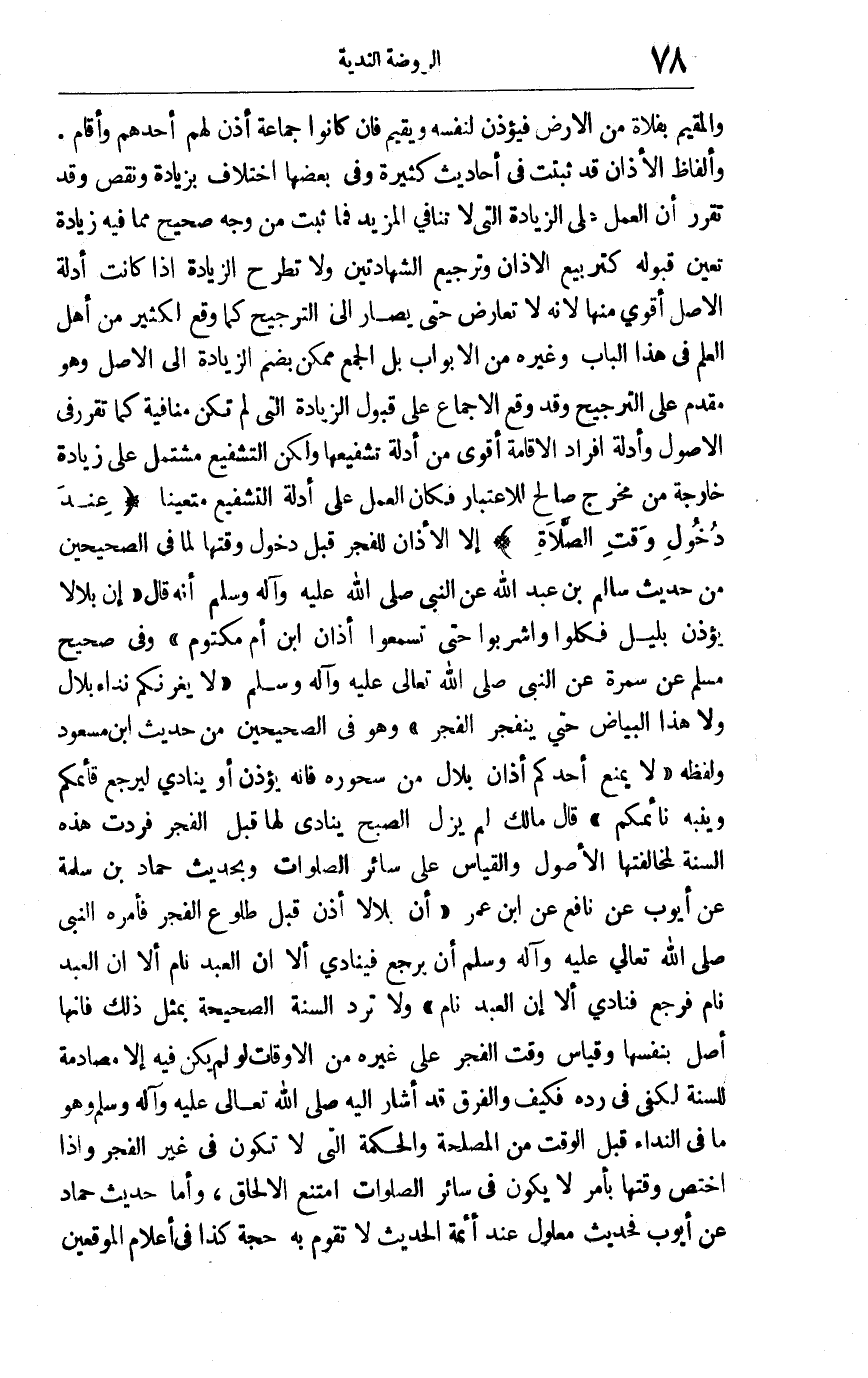 والمقيم بفلاة من الأرض فيؤذن لنفسه ويقيم فإن كانوا جماعة أذن لهم أحدهم وأقام وألفاظ الأذان قد ثبتت في أحاديث كثيرة وفي بعضها اختلاف بزيادة ونقص وقد تقرر أن العمل على الزيادة التي لا تنافي المزيد فما ثبت من وجه صحيح مما فيه زيادة تعين قبوله كتربيع الأذان وترجيع الشهادتين ولا تطرح الزيادة إذا كانت أدلة الأصل أقوى منها لأنه لا تعارض حتى يصار إلى الترجيح كما وقع لكثير من أهل العلم في هذا الباب وغيره من الأبواب بل الجمع ممكن بضم الزيادة إلى الأصل وهو مقدم على الترجيح وقد وقع الإجماع على قبول الزيادة التي لم تكن منافية كما تقرر في الأصول وأدلة إفراد الإقامة أقوى من أدلة تشفيعها ولكن التشفيع مشتمل على زيادة خارجة من مخرج صالح للاعتبار فكان العمل على أدلة التشفيع متعينا. "عند دخول وقت الصلاة" إلا الأذان للفجر قبل دخول وقتها لما في الصحيحين من حديث سالم بن عبد الله عن النبي صلى الله عليه وآله وسلم أنه قال: "إن بلالا يؤذن بليل فكلوا واشربوا حتى تسمعوا أذان ابن أم مكتوم" وفي صحيح مسلم عن سمرة عن النبي صلى الله تعالى عليه وآله وسلم: "لا يغرنكم نداء بلال ولا هذا البياض حتى ينفجر الفجر" وهو في الصحيحين من حديث ابن مسعود ولفظه: "لا يمنع أحدكم أذان بلال من سحوره فإنه يؤذن أو ينادي ليرجع قائمكم وينبه نائمكم". قال مالك: لم يزل الصبح ينادى لها قبل الفجر فردت هذه السنة لمخالفتها الأصول والقياس على سائر الصلوات وبحديث حماد بن سلمة عن أيوب عن نافع عن ابن عمر: أن بلالاً أذن قبل طلوع الفجر فأمره النبي صلى الله تعالى عليه وآله وسلم أن يرجع فينادي ألا إن العبد نام ألا إن العبد نام فرجع فنادى ألا إن العبد نام. ولا ترد السنة الصحيحة بمثل ذلك فإنها أصل بنفسها وقياس وقت الفجر على غيره من الأوقات لو لم يكن فيه إلا مصادمة للسنة لكفى في رده فكيف والفرق قد أشار إليه صلى الله تعالى عليه وآله وسلم وهو ما في النداء قبل الوقت من المصلحة والحكمة التي لا تكون في غير الفجر وإذا اختص وقتها بأمر لا يكون في سائر الصلوات امتنع الإلحاق. وأما حديث حماد عن أيوب فحديث معلول عند أئمة الحديث لا تقوم به حجة كذا في إعلام الموقعين