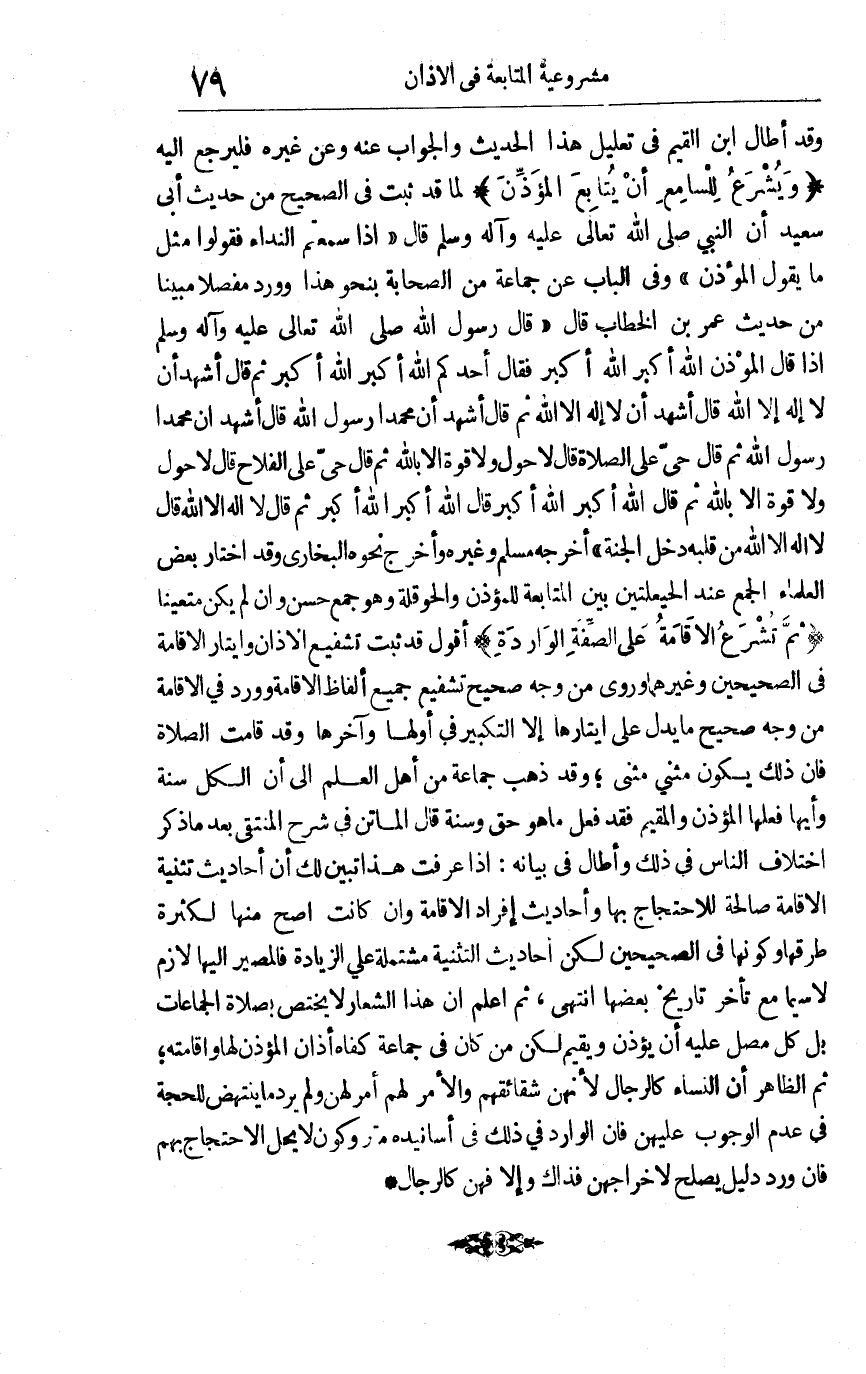 وقد أطال ابن القيم في تعليل هذا الحديث والجواب عنه وعن غيره فليرجع إليه. ويشرع للسامع أن يتابع المؤذن لما قد ثبت في الصحيح من حديث أبي سعيد أن النبي صلى الله تعالى عليه وآله وسلم قال: "إذا سمعتم النداء فقولوا مثل ما يقول المؤذن". وفي الباب عن جماعة من الصحابة بنحو هذا وورد مفصلاً مبيناً من حديث عمر بن الخطاب قال: قال رسول الله صلى الله تعالى عليه وآله وسلم: "إذا قال المؤذن: الله أكبر الله أكبر فقال أحدكم الله أكبر الله أكبر ثم قال: أشهد أن إله إلا الله قال: أشهد أن لا إله إلا الله ثم قال: أشهد أن محمداً رسول الله قال: أشهد أن محمداً رسول الله ثم قال: حي على الصلاة قال: لا حول ولا قوة إلا بالله ثم قال: حي على الفلاح قال: لا حول ولا قوة إلى بالله ثم قال: الله أكبر الله أكبر قال: الله أكبر الله أكبر ثم قال: لا إله إلا الله قال: لا إله إلا الله من قلبه دخل الجنة". أخرجه مسلم وغيره وأخرج نحوه البخاري وقد اختار بعض العلماء الجمع عند الحيعلتين بين المتابعة للمؤذن والحوقلة وهو جمع حسن وإن لم يكن متعينا. ثم تشرع الإقامة على الصفة الواردة أقول: قد ثبت تشفيع الأذان وايتاء الإقامة في الصحيحين وغيرهما وروي من وجه صحيح تشفيع جميع ألفاظ الإقامة وورد في الإقامة من وجه صحيح ما يدل على إيتارها إلا التكبير في أولها وآخرها وقد قامت الصلاة فإن ذلك يكون مثنى مثنى وقد ذهب جماعة من أهل العلم إلى أن الكل سنة وأيها فعلها المؤذن والمقيم فقد فعل ما هو حق وسنة قال الماتن في شرح المنتقى بعد ما ذكر اختلاف الناس في ذلك وأطال في بيانه: إذا عرفت هذا تبين لك أن أحاديث تثنية الإقامة صالحة للاحتجاج بها وأحاديث إفراد الإقامة وإن كانت أصح منها لكثرة طرقها وكونها في الصحيحين لكن أحاديث التثنية مشتملة على الزيادة فالمصير إليها لازم لا سيما مع تأخر تاريخ بعضها انتهى ثم اعلم أن هذا الشعار لا يختص بصلاة الجماعات بل كل مصل عليه أن يؤذن ويقيم لكن من كان في جماعة كفاه أذان المؤذن لها وإقامته ثم الظاهر أن النساء كالرجال لأنهن شقائقهم والأمر لهم أمر لهن ولم يرد ما ينتهض للحجة في عدم الوجوب عليهن فإن الوارد في ذلك في أسانيده متروكون لا يحل الاحتجاج بهم فإن ورد دليل يصلح لإخراجهن فذاك وإلا فهن كالرجال