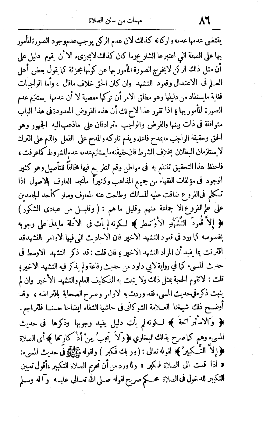 يقتضي عدمها عدمه وأركانه كذلك لأن عدم الركن يوجب عدم وجود الصورة المأمور بها على الصفة التي اعتبرها الشارع وما كان كذلك لا يجزئ إلا أن يقوم دليل على أن مثل ذلك الركن لا يخرج الصورة المأمور بها عن كونها مجزئة كما يقول بعض أهل العلم في الاعتدال وقعود التشهد وإن كان الحق خلاف ما قال وأما الواجبات فغاية ما يستفاد من دليلها وهو مطلق الأمر أن تركها معصية لا أن عدمها يستلزم عدم الصورة المأمور بها إذا تقرر هذا لاح لك أن هذه الفروض المعدودة في هذا الباب متوافقة في ذات بينها والفرض والواجب مترادفان على ما ذهب إليه الجمهور وهو الحق وحقيقة الواجب ما يمدح فاعله ويذم تاركه والمدح على الغعل والذم على الترك لا يستلزمان البطلان بخلاف الشرط فإن حقيقته ما يستلزم عدمه عدم المشروط كما عرفت فاحفظ هذا التحقيق تنتفع به في مواطن وقع التفريع فيها مخالفا للتأصيل وهو كثير الوجود في مؤلفات الفقهاء من جميع المذاهب وكثيرا ما تجد العارف بالأصول إذا تكلم في الفروع ضاقت عليه المسالك وطاحت عنه المعارف وصار كأحد الجامدين على علم الفروع إلا جماعة منهم {وَقَلِيلٌ مَا هُمْ} {وَقَلِيلٌ مِنْ عِبَادِيَ الشَّكُورُ} إلا قعود التشهد الأوسط لكونه لم يأت في الأدلة في ما يدل على وجوبه بخصوصه كما ورد في قعود التشهد الأخير فإن الأحاديث التي فيها الأوامر بالتشهد قد اقترنت بما يفيد أن المراد التشهد الأخير فإن قلت: قد ذكر التشهد الأوسط في حديث المسيء كما في رواية لأبي داود من حديث رفاعة ولم يذكر فيه التشهد الأخير قلت: تقوم الحجة بمثل ذلك ولا يثبت به التكليف العام والتشهد الأخير وإن لم يثبت ذكره في حديث المسيء فقد وردت به الأوامر وصرح الصحابة بافتراضه وقد أوضح ذلك شيخنا العلامة الشوكاني في حاشية الشفاء إيضاحا حسنا فلتراجع. "والاستراحة" لكونه لم يأت دليل يفيد وجوبها وذكرها في حديث المسيء وهم كما صرح بذلك البخاري, ولا يجب من أذكارها أي الصلاة إلا التكبير لقوله تعالى: {وَرَبَّكَ فَكَبِّرْ} ولقوله صلى الله وسلم عليه في حديث المسيء: "إذا قمت إلى الصلاة فكبر" ولما ورد من أن تحريم الصلاة التكبير. أقول: تعيين التكبير للدخول في الصلاة محكم صريح لقوله صلى الله تعالى عليه وآله وسلم: