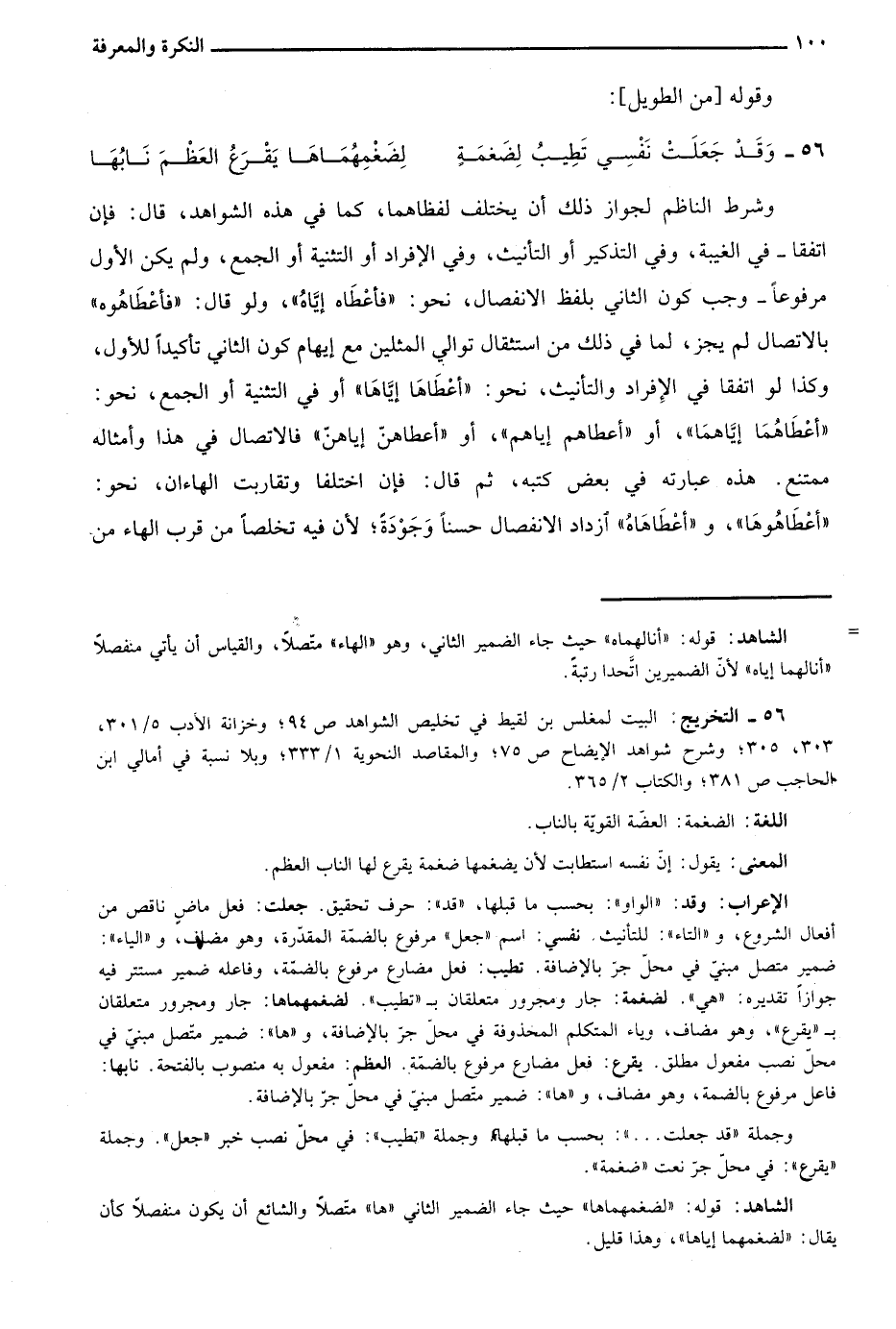 الإعراب: وقد: "الواو": بحسب ما قبلها، "قد": حرف تحقيق. جعلت: فعل ماض ناقص من أفعال الشروع، و"التاء": للتأنيث. نفسي: اسم "جعل" مرفوع بالضمة المقدرة، وهو مضاف، و"الياء": ضمير متصل مبني في محل جر بالإضافة. تطيب: فعل مضارع مرفوع بالضمة، وفاعله ضمير مستتر فيه جوازا تقديره: "هي". لضغمة: جار ومجرور متعلقان بـ"تطيب". لضغمهماها: جار ومجرور متعلقان بـ"يقرع"، وهو مضاف، وياء المتكلم المحذوفة في محل جر بالإضافة، و"ها": ضمير متصل مبني في محل نصب مفعول مطلق. يقرع: فعل مضارع مرفوع بالضمة. العظم: مفعول به منصوب بالفتحة. نابها: فاعل مرفوع بالضمة، وهو مضاف، و"ها": ضمير متصل مبني في محل جر بالإضافة.