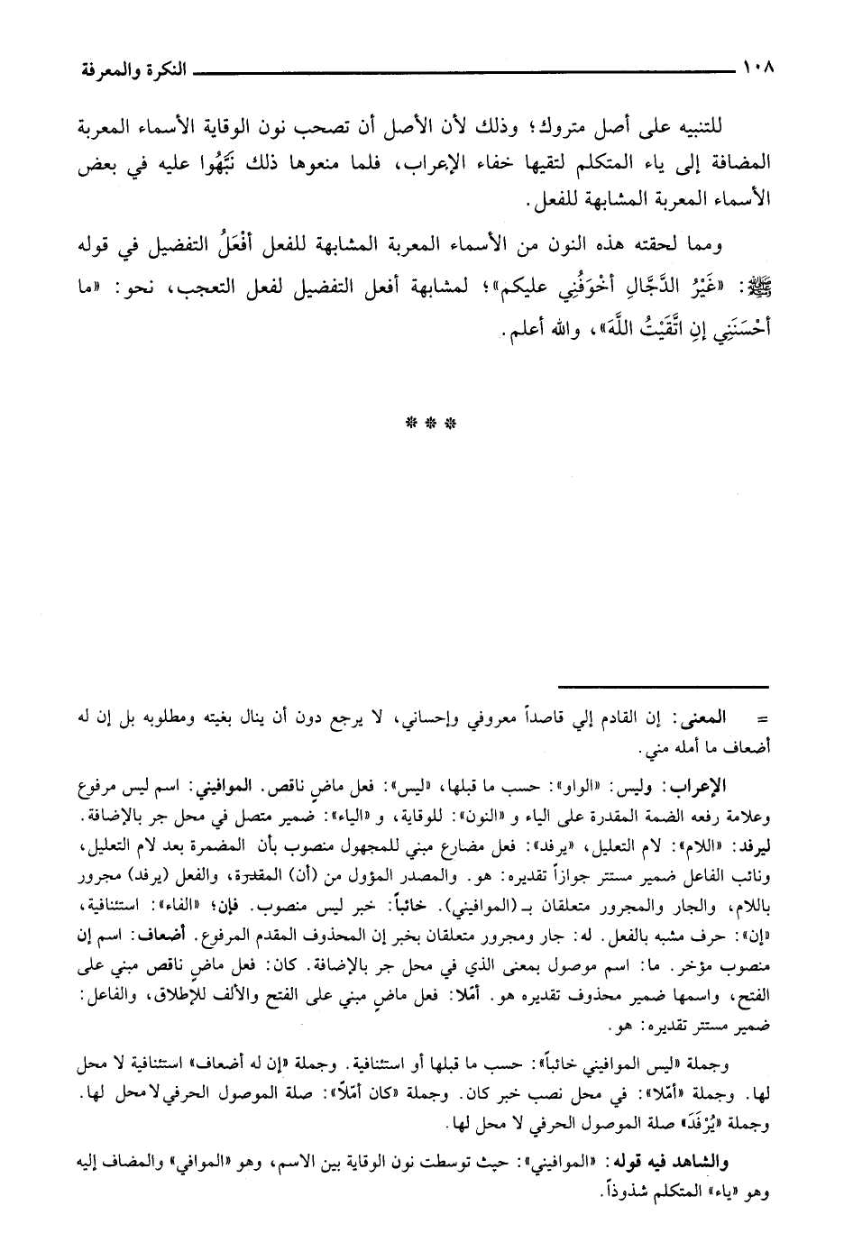 والشاهد فيه قوله: "الموافيني": حيث توسطت نون الوقاية بين الاسم، وهو "الموافي" والمضاف إليه وهو "ياء" المتكلم شذوذا.