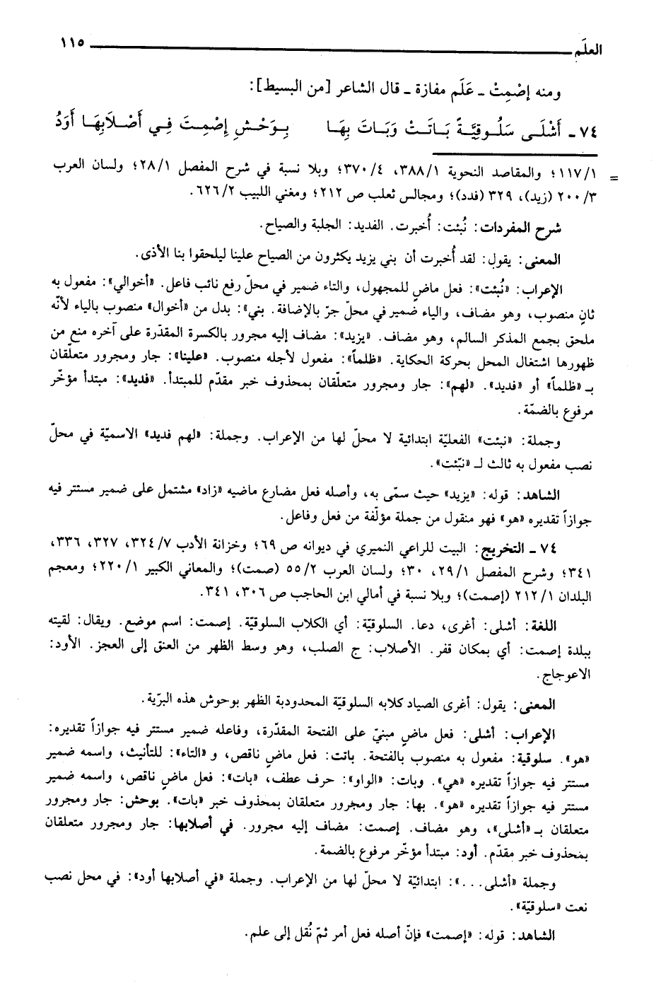74- التخريج: البيت للراعي النميري في ديوانه ص69؛ وخزانة الأدب 7/ 324، 327، 336، 341؛ وشرح المفصل 1/ 29، 30؛ ولسان العرب 2/ 55 "صمت"؛ والمعاني الكبير 1/ 220؛ ومعجم البلدان 1/ 212 "إصمت"؛ وبلا نسبة في أمالي ابن الحاجب ص306، 341.