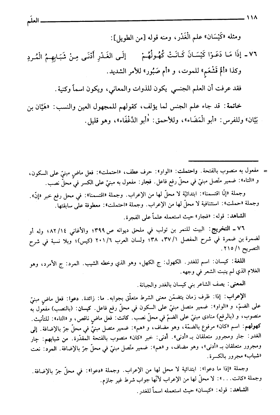 76- التخريج: البيت للنمر بن تولب في ملحق ديوانه ص399؛ والأغاني 14/ 82؛ وله أو لضمرة بن ضمرة في شرح المفصل 1/ 37، 38؛ ولسان العرب 6/ 201 "كيس"؛ وبلا نسبة في شرح التصريح 1/ 215.