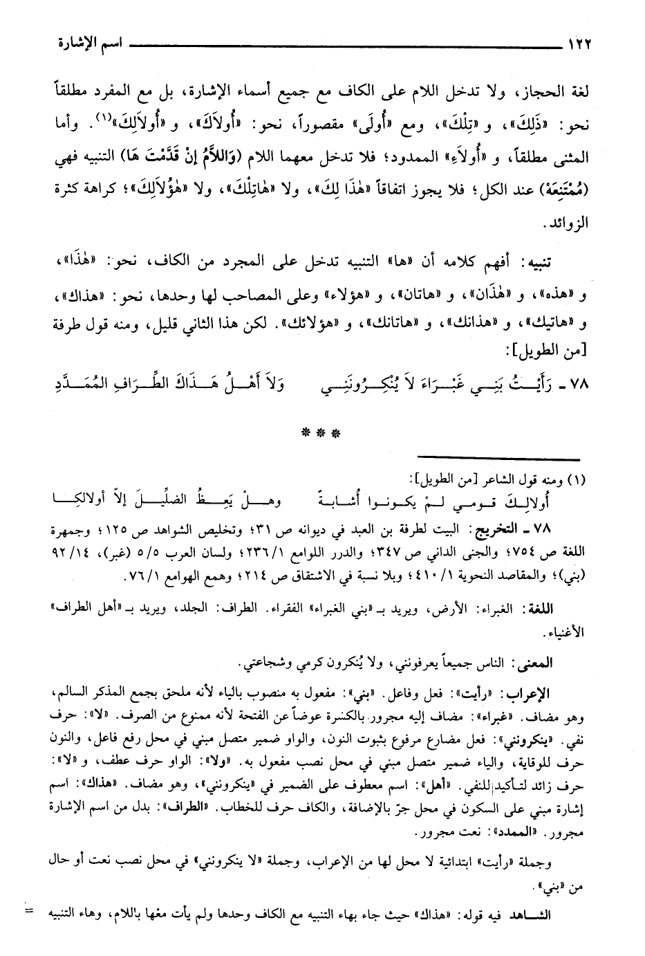تنبيه: أفهم كلامه أن "ها" التنبيه تدخل على المجرد من الكاف، نحو: "هذا"، و"هذه"، و"هذان"، و"هاتان"، و"هؤلاء" وعلى المصاحب لها وحدها، نحو: "هذاك"، و"هاتيك"، و"هذانك"، و"هاتانك"، و"هؤلائك". لكن هذا الثاني قليل، ومنه قول طرفة "من الطويل":
