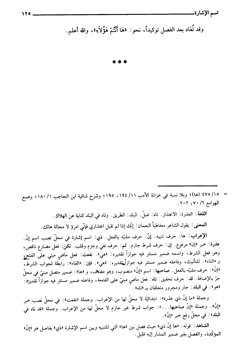 الشاهد: قوله: "ها إن ذي" حيث فصل بين "ها" التي للتنبيه وبين اسم الإشارة "ذي" بفاصل هو "إن" المؤكدة، والفصل بغير ضمير المشار إليه قليل.