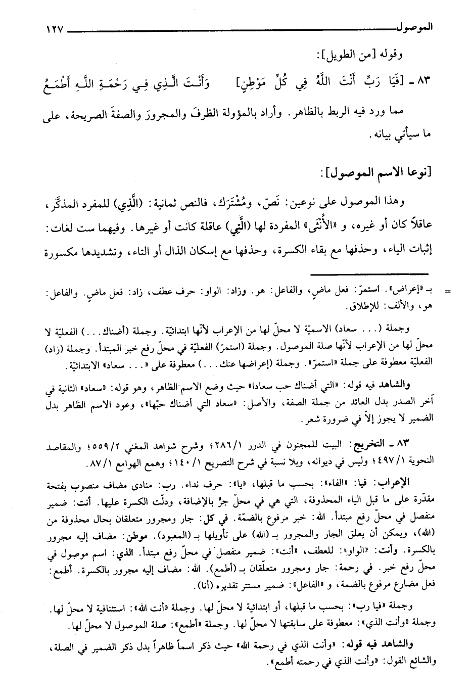 وهذا الموصول على نوعين: نص، ومشترك، فالنص ثمانية: "الَّذِي" للمفرد المذكر، عاقلا كان أو غيره، و"الأُنْثَى" المفردة لها "الَّتِي" عاقلة كانت أو غيرها. وفيهما ست لغات: إثبات الياء، وحذفها مع بقاء الكسرة، وحذفها مع إسكان الذال أو التاء، وتشديدها مكسورة