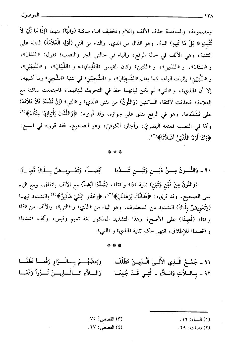 "وَالنُّونُ مِنْ ذَيْن وَتَيْنِ" تثنية "ذا" و"تا" "شُدِّدا أَيْضا" مع الألف باتفاق، ومع الياء على الصحيح، وقد قرئ: "فذانِّك برهانان"3، و"إحدى ابنتي هاتيْنِّ"4 بالتشديد فيهما "وَتَعْويضٌ بِذَاكَ" التشديد من المحذوف، وهو الياء من "الذي" و"التي"، والألف من "ذا" و"تا" "قُصِدَا" على الأصح؛ وهذا التشديد المذكور لغة تميم وقيس، وألف "شددا" و"قصدا" للإطلاق، انتهى حكم تثنية "الذي" و"التي".