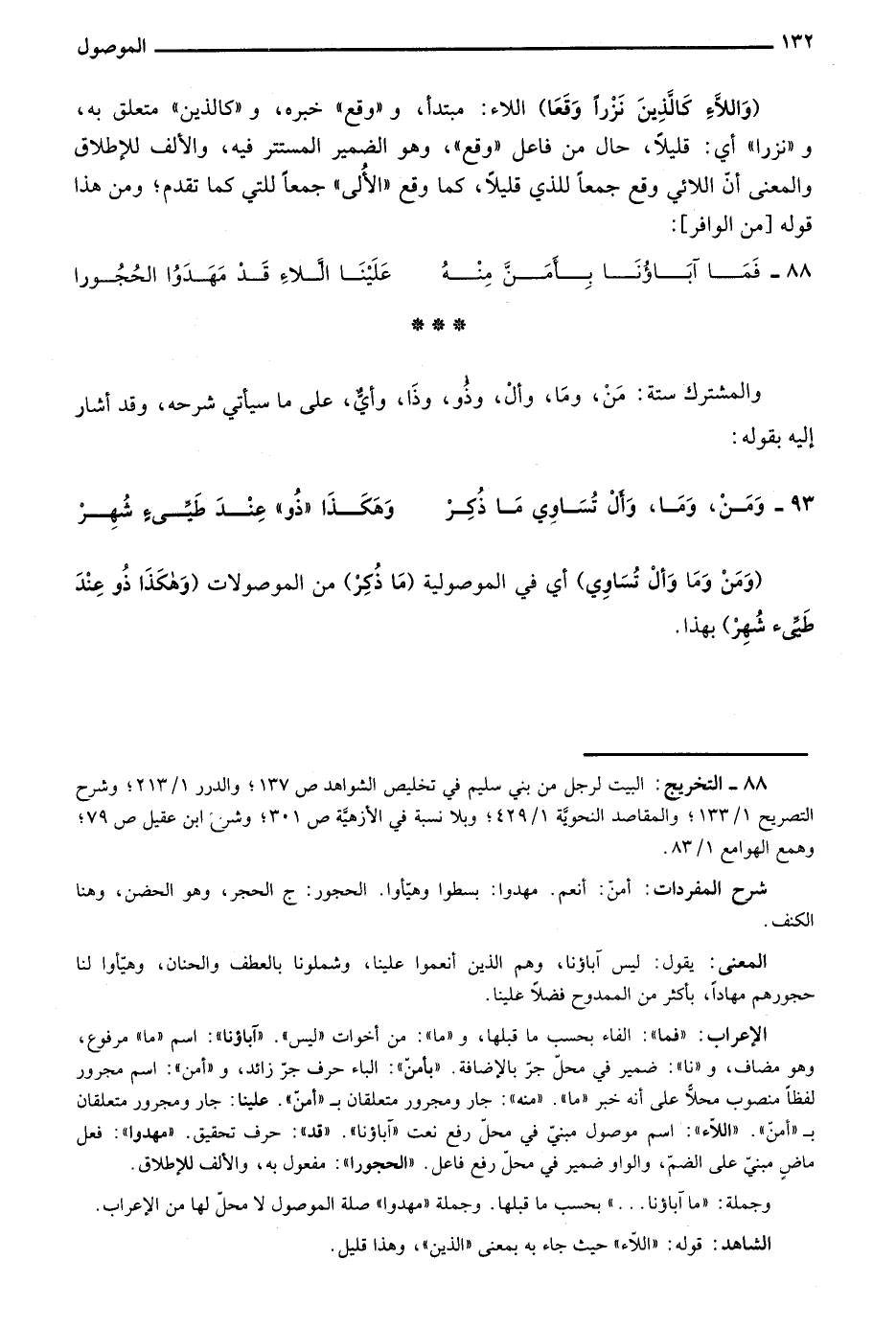 88- التخريج: البيت لرجل من بني سليم في تخليص الشواهد ص137؛ والدرر 1/ 213؛ وشرح التصريح 1/ 133؛ والمقاصد النحوية 1/ 429؛ وبلا نسبة في الأزهية ص301؛ وشرح ابن عقيل ص79؛ وهمع الهوامع 1/ 83.