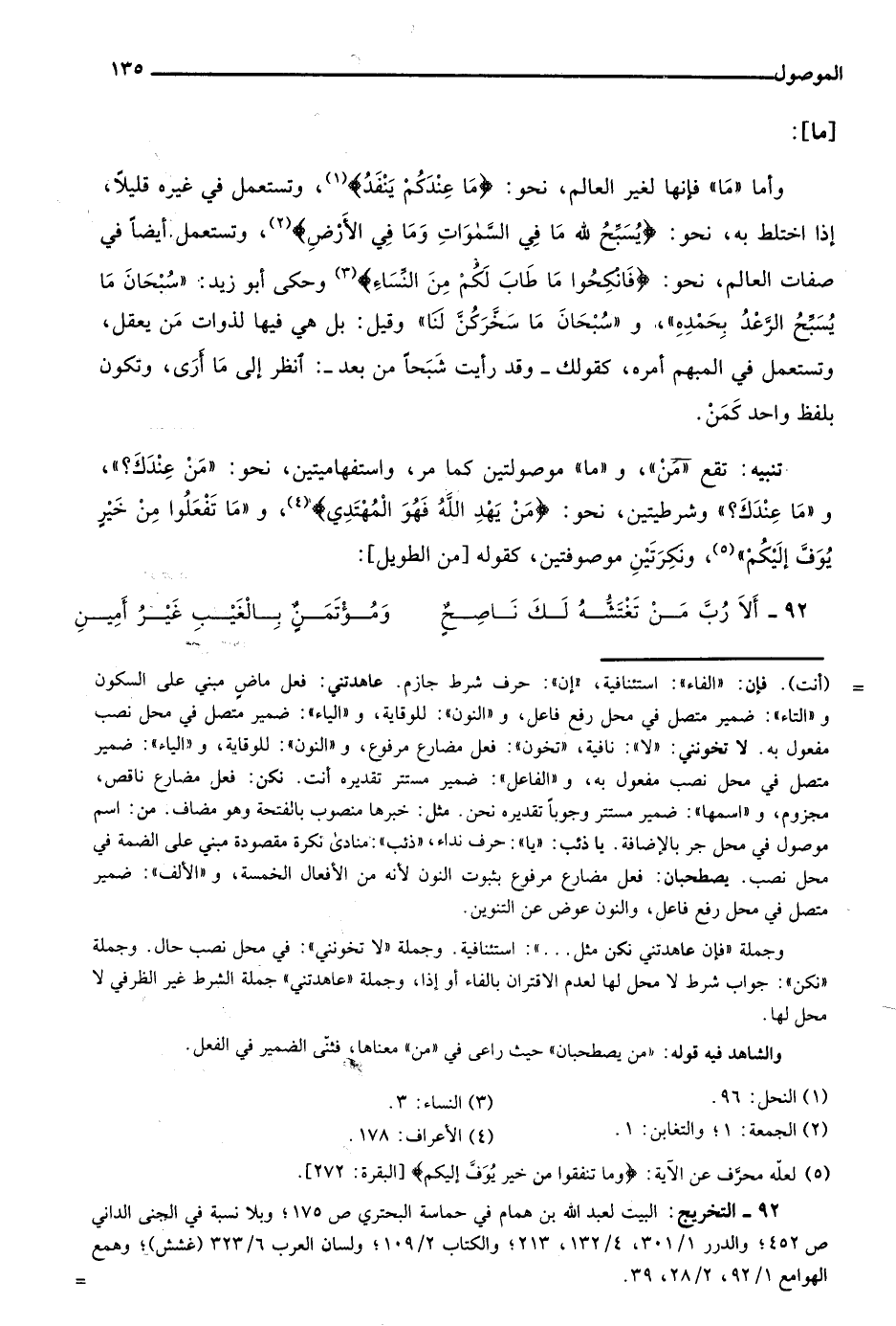 وأما "ما" فإنها لغير العالم، نحو: {مَا عِنْدَكُمْ يَنْفَدُ} 1، وتستعمل في غيره قليلا، إذا اختلط به، نحو: {يُسَبِّحُ لِلَّهِ مَا فِي السَّمَاوَاتِ وَمَا فِي الْأَرْضِ} 2، وتستعمل أيضا في صفات العالم، نحو: {فَانْكِحُوا مَا طَابَ لَكُمْ مِنَ النِّسَاءِ} 3 وحكى أبو زيد: "سبحان ما يسبح الرعد بحمده"، و"سبحان ما سخركنَّ لنا"، وقيل: بل هي فيها لذوات من يعقل، وتستعمل في المبهم أمره، كقولك وقد رأيت شبحا من بعد: انظر إلى ما أرى، وتكون بلفظ واحد كمن.