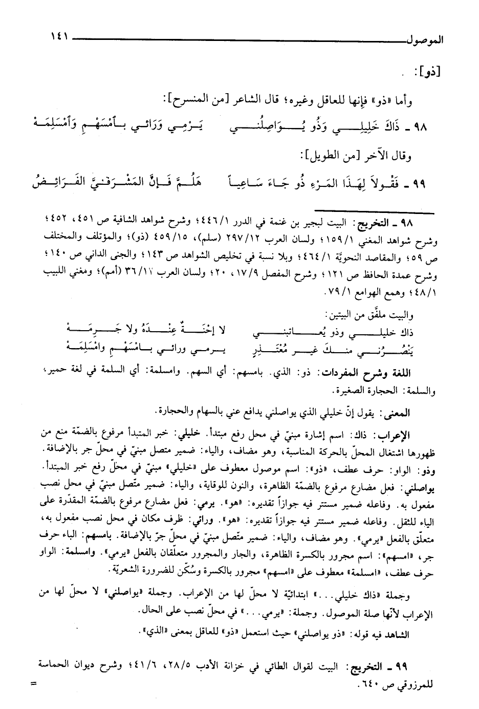 الإعراب: ذاك: اسم إشارة مبني في محل رفع مبتدأ. خليلي: خبر المبتدأ مرفوع بالضمة منع من ظهورها اشتغال المحل بالحركة المناسبة، وهو مضاف، والياء: ضمير متصل مبني في محل جر بالإضافة. وذو: الواو: حرف عطف، "ذو": اسم موصول معطوف على "خليلي" مبني في محل رفع خبر المبتدأ. يواصلني: فعل مضارع مرفوع بالضمة الظاهرة، والنون للوقاية، والياء: ضمير متصل مبني في محل نصب مفعول به. وفاعله ضمير مستتر فيه جوازا تقديره: "هو". يرمي: فعل مضارع مرفوع بالضمة المقدرة على الياء للثقل. وفاعله ضمير مستتر فيه جوازا تقديره: "هو". ورائي: ظرف مكان في محل نصب مفعول به، متعلق بالفعل "يرمي". وهو مضاف، والياء: ضمير متصل مبني في محل جر بالإضافة. بامسهم: الباء حرف جر، "امسهم": اسم مجرور بالكسرة الظاهرة، والجار والمجرور متعلقان بالفعل "يرمى". وامسلمة: الواو حرف عطف، "امسلمة" معطوف على "امسهم" مجرور بالكسرة وسكن للضرورة الشعرية.