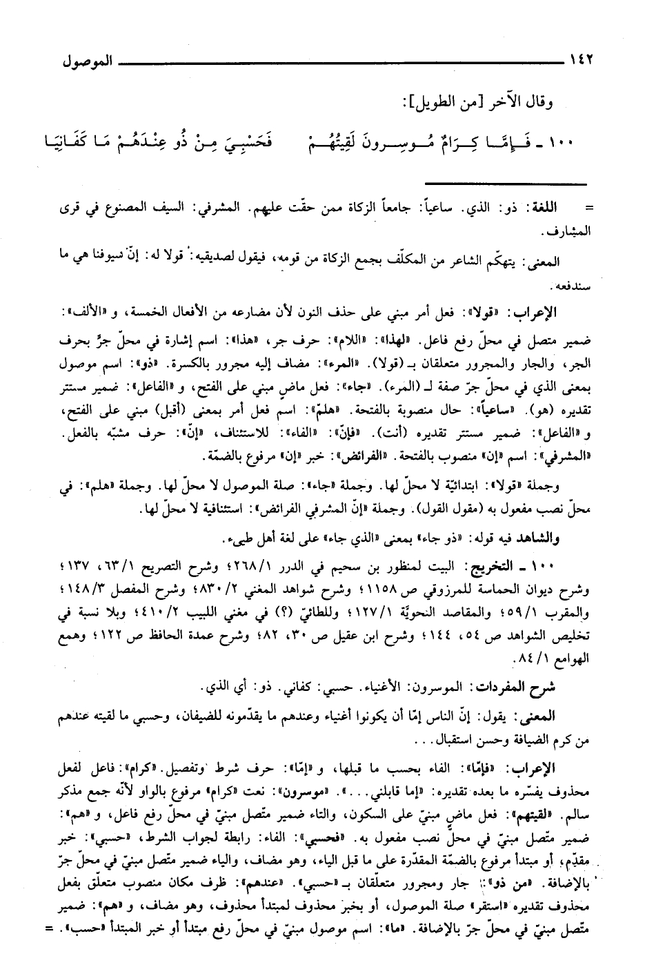 الإعراب: "فإما": الفاء بحسب ما قبلها، و"إما": حرف شرط وتفصيل. "كرام": فاعل لفعل محذوف يفسره ما بعده تقديره: "إما قابلني ... ". "موسرون": نعت "كرام" مرفوع بالواو لأنه جمع مذكر سالم. "لقيتهم": فعل ماض مبني على السكون، والتاء ضمير متصل مبني في محل رفع فاعل، و"هم": ضمير متصل مبني في محل نصب مفعول به. "فحسبي": الفاء: رابطة لجواب الشرط، "حسبي": خبر مقدم، أو مبتدأ مرفوع بالضمة المقدرة على ما قبل الياء، وهو مضاف، والياء ضمير متصل مبني في محل جر بالإضافة. "من ذو": جار ومجرور متعلقان بـ"حسبي". "عندهم": ظرف مكان منصوب متعلق بفعل محذوف تقديره "استقر" صلة الموصول، أو بخبر محذوف لمبتدأ محذوف، وهو مضاف، و"هم": ضمير متصل مبني في محل جر بالإضافة. "ما": اسم موصول مبني في محل رفع مبتدأ أو خبر المبتدأ "حسب". =