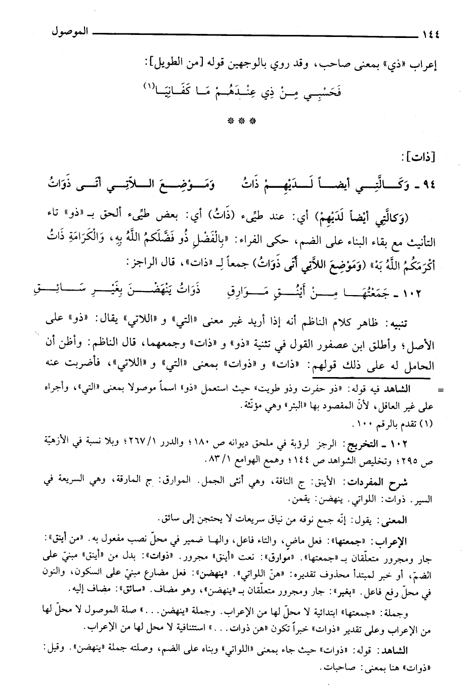 "وكَالَّتِي أَيْضا لَديهمْ" أي: عند طيئ "ذَاتُ" أي: بعض طيئ أَلحق بـ"ذو" تاء التأنيث مع بقاء البناء على الضم، حكى الفراء: "بالفضل ذو فضلكم الله به، والكرامة ذات أكرمكم الله به" "وَمَوْضِعَ الَّلاتِي أتى ذَوَاتُ" جمعا لـ"ذات"، قال الراجز: