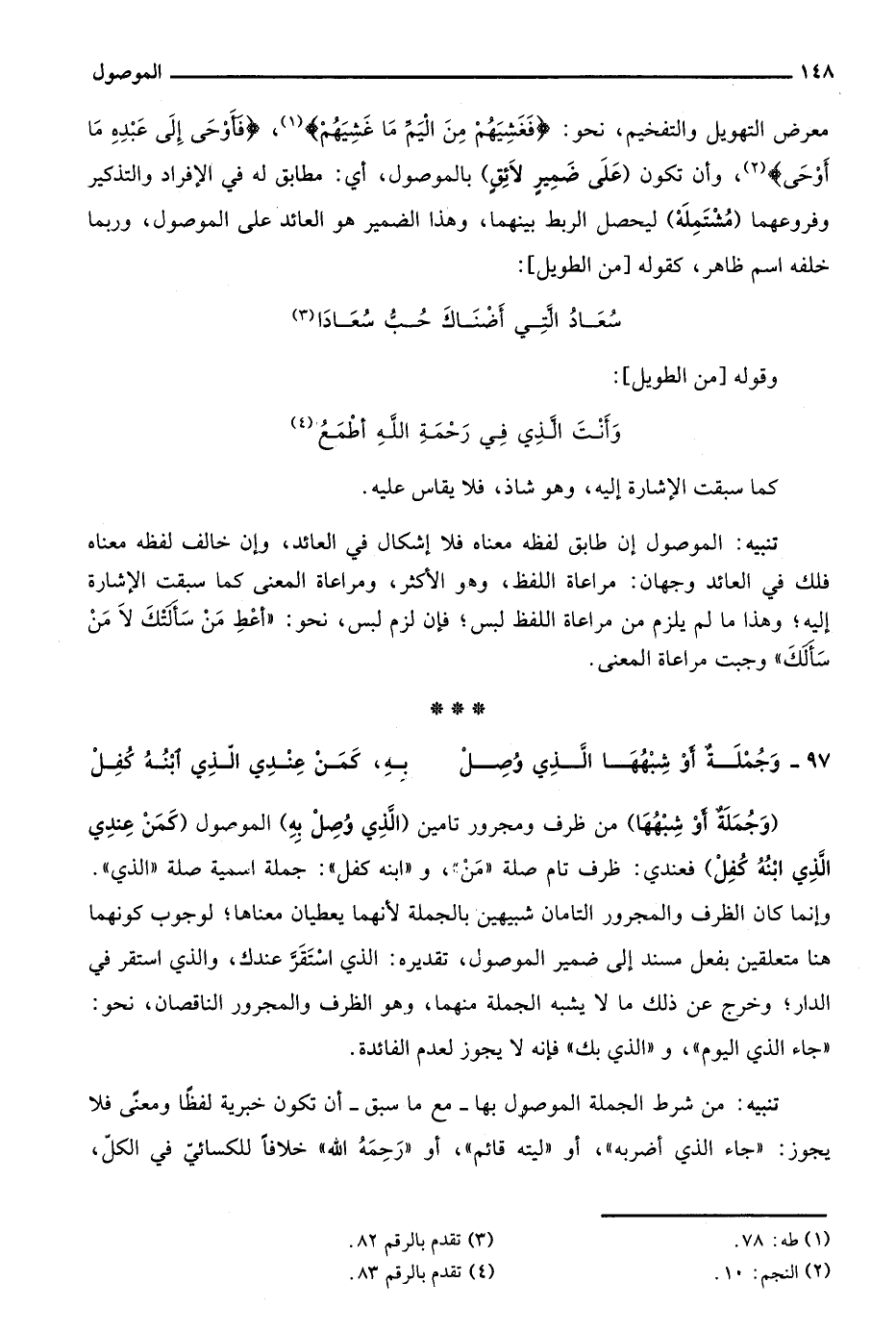 تنبيه: الموصول إن طابق لفظه معناه فلا إشكال في العائد، وإن خالف لفظه معناه فلك في العائد وجهان: مراعاة اللفظ، وهو الأكثر، ومراعاة المعنى كما سبقت الإشارة إليه؛ وهذا ما لم يلزم من مراعاة اللفظ لبس؛ فإن لزم لبس؛ نحو: "أعط من سألتك لا من سألك" وجبت مراعاة المعنى.