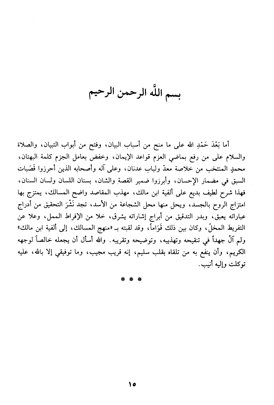 أما بعد حمد الله على ما منح من أسباب البيان، وفتح من أبواب التبيان، والصلاة والسلام على من رفع بماضي العزم قواعد الإيمان، وخفض بعامل الجزم كلمة البهتان، مُحَمَّدٍ المنتخب من خلاصة معد ولباب عدنان، وعلى آله وأصحابه الذين أحرزوا قصبات السبق في مضمار الإحسان، وأبرزوا ضمير القصة والشان، بسنان اللسان ولسان السنان، فهذا شرح لطيف بديع على ألفية ابن مالك، مهذب المقاصد واضح المسالك، يمتزج بها امتزاج الروح بالجسد، ويحل منها محل الشجاعة من الأسد، تجد نشر التحقيق من أدراج عباراته يعبق، وبدر التدقيق من أبراج إشاراته يشرق، خلا من الإفراط الممل، وعلا عن التفريط المخل، وكان بين ذلك قوامًا, وقد لقبته بـ"منهج المسالك، إلى ألفية ابن مالك", ولم آل جهدا في تنقيحه وتهذيبه، وتوضيحه وتقريبه. والله أسأل أن يجعله خالصاً لوجهه الكريم، وأن ينفع به من تلقاه بقلب سليم، إنه قريب مجيب، وما توفيقي إلا بالله، عليه توكلت وإليه أنيب.
