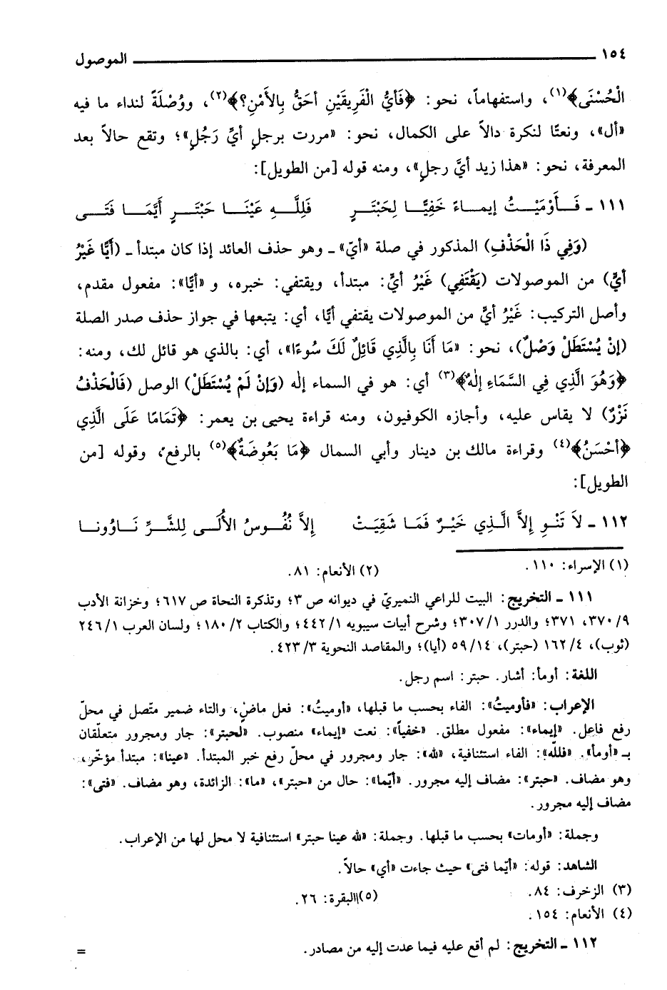 111- التخريج: البيت للراعي النميري في ديوانه ص3؛ وتذكرة النحاة ص617؛ وخزانة الأدب 9/ 370، 371؛ والدرر 1/ 307؛ وشرح أبيات سيبويه 1/ 442؛ والكتاب 2/ 180؛ ولسان العرب 1/ 246 "ثوب"، 4/ 162 "حبتر"، 14/ 59 "أيا"؛ والمقاصد النحوية 3/ 423.